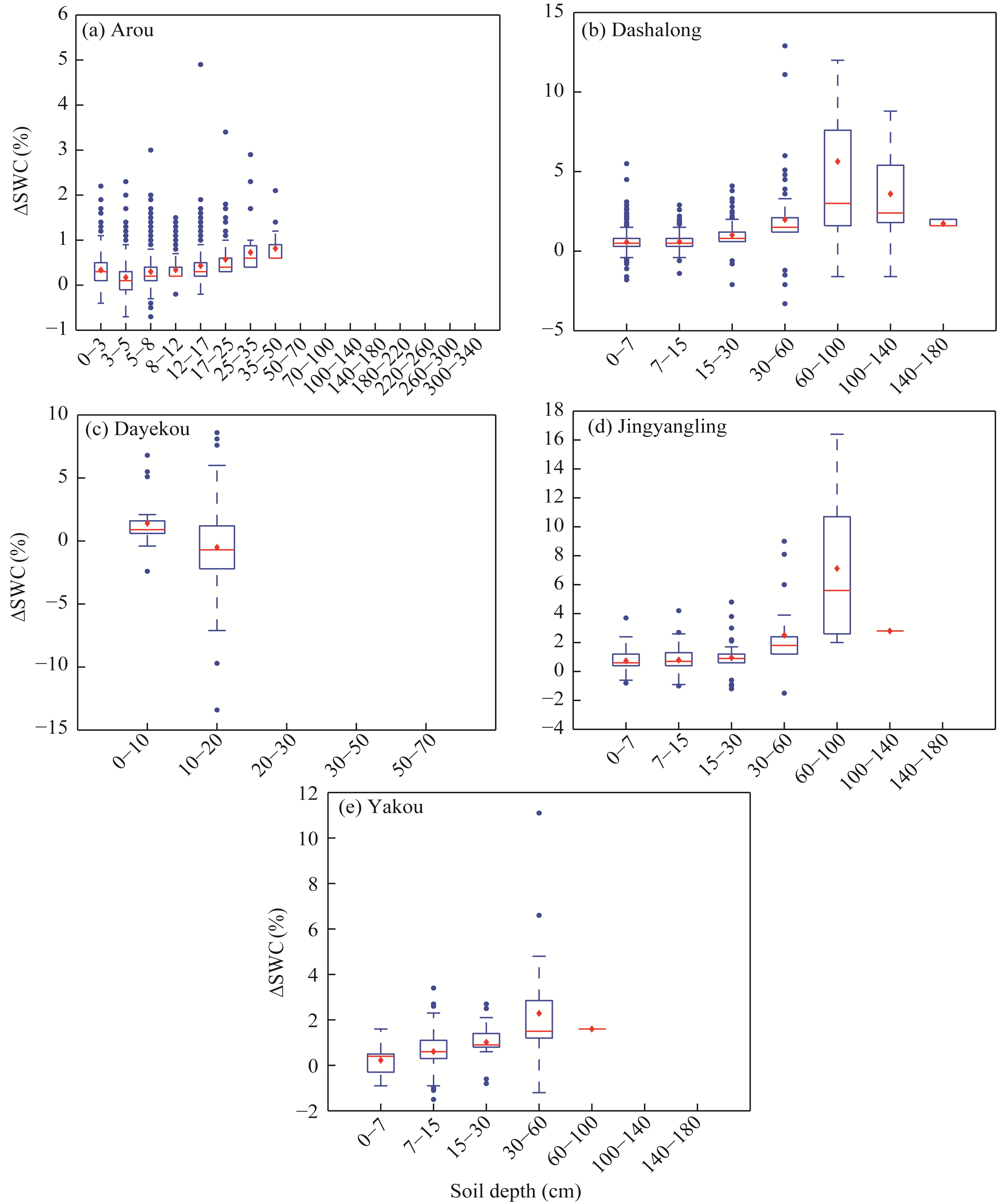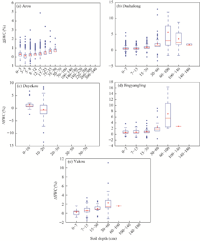 Fig. 1 Hourly changes of soil water content (ΔSWC) at five in situ observation sites. (a), Arou; (b), Dashalong; (c), Dayekou; (d), Jingyangling; (e), Yakou. Boxes in the figure indicate the IQR (interquartile range, 75th to 25th of the data). The median value is shown as a line within the box. Red diamond is shown as mean. Outlier is shown as blue circle. Whiskers extend to the most extreme value within 1.5×IQR. |