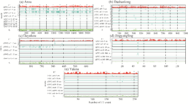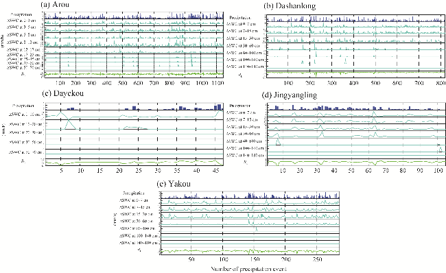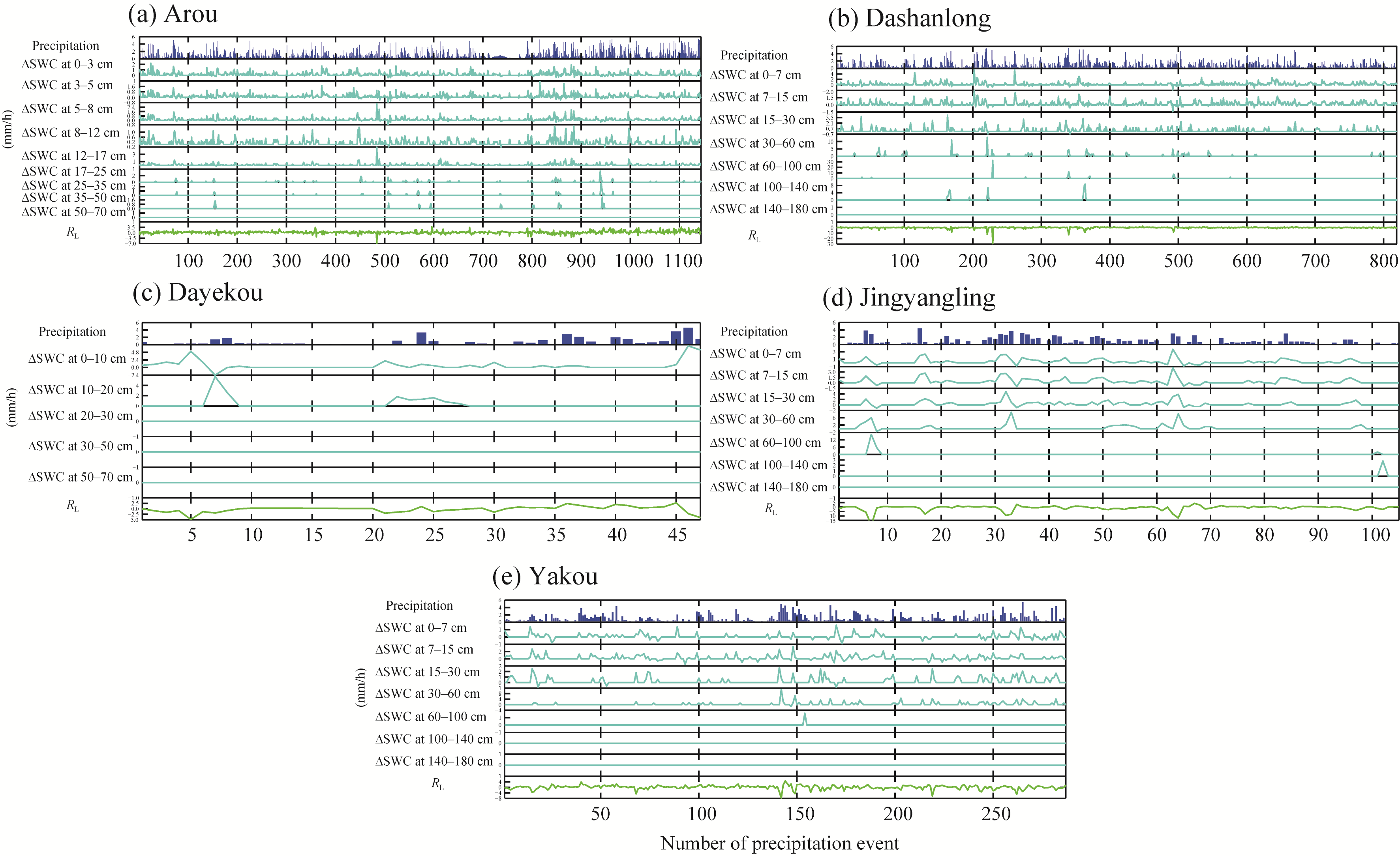 Fig. 2 Subsurface hydrological partitioning during precipitation process. (a), Arou; (b), Dashalong; (c), Dayekou; (d), Jingyangling; (e), Yakou. |