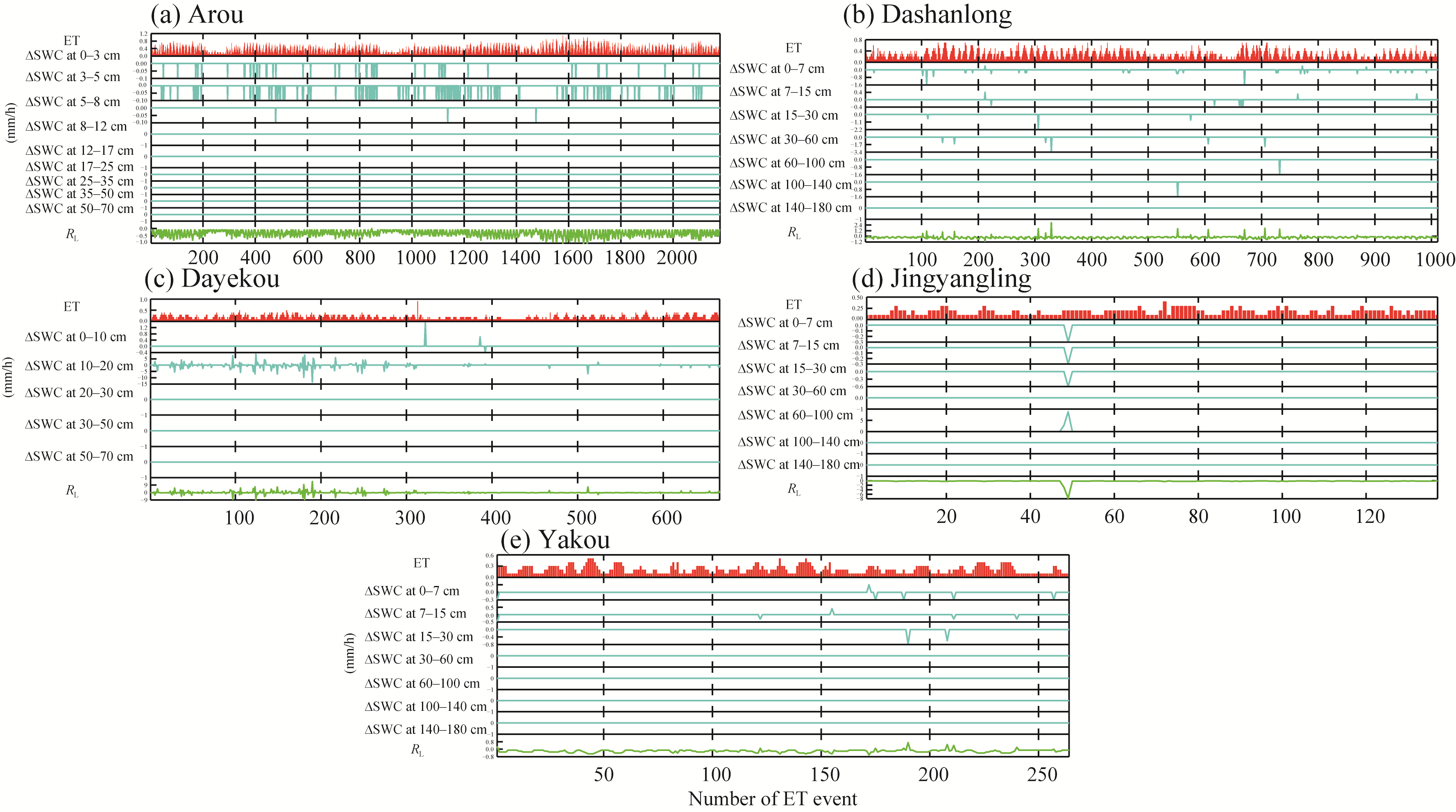 Fig. 4 Subsurface hydrological partitioning during evapotranspiration (ET) process. (a), Arou; (b), Dashalong; (c), Dayekou; (d), Jingyangling; (e), Yakou. |