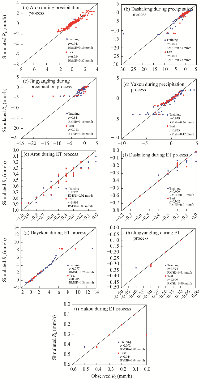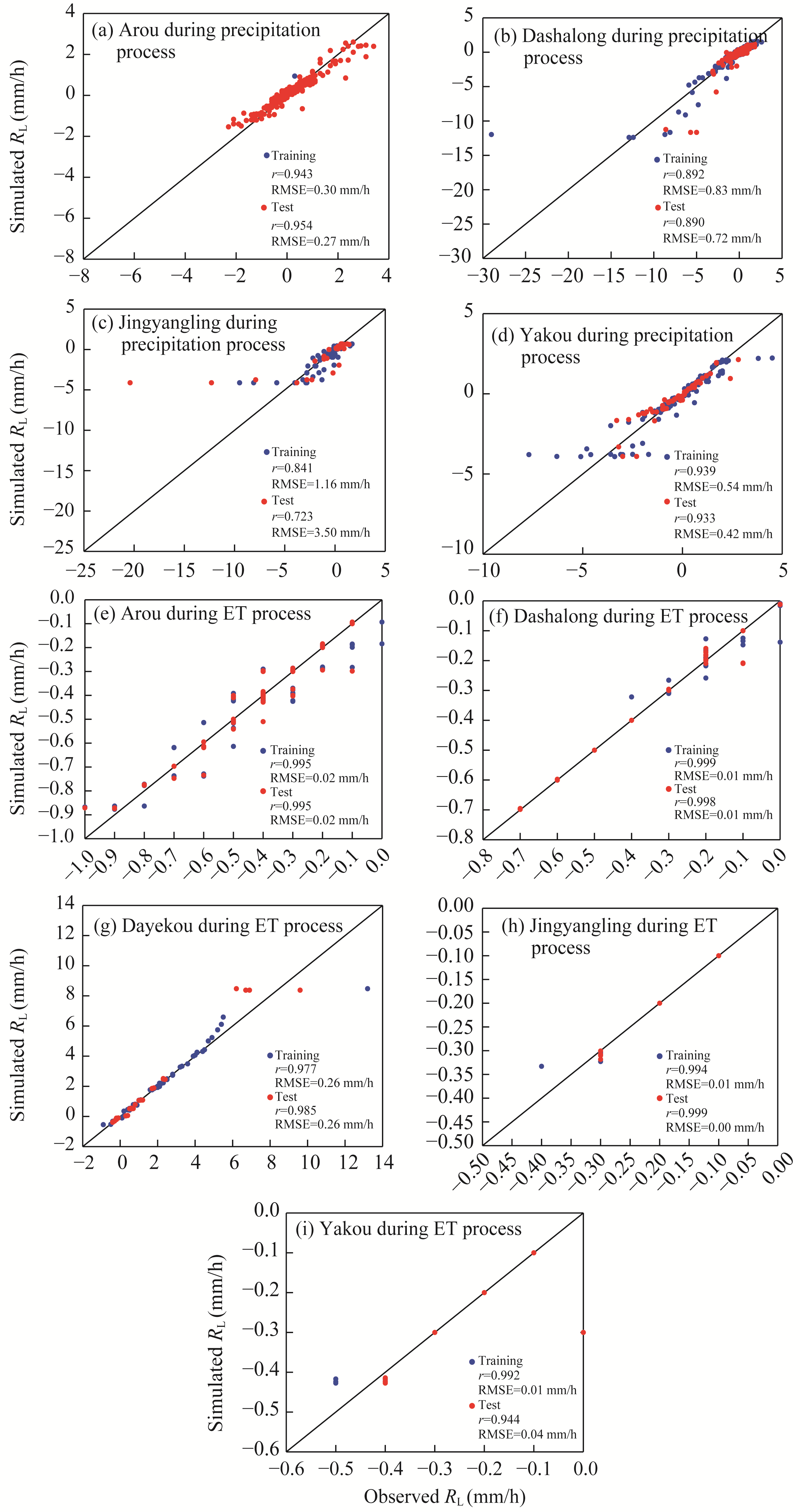 Fig. 6 Simulated result of lateral flow through random forest model. (a-d), Arou, Dashalong, Jingyangling, and Yakou sites during precipitation process; (e-i), Arou, Dashalong, Dayekou, Jingyangling, and Yakou sites during ET process. RMSE, root mean square errors. |