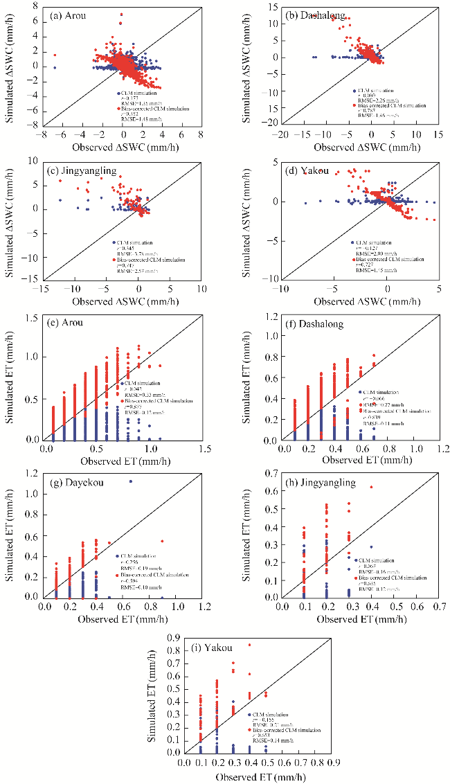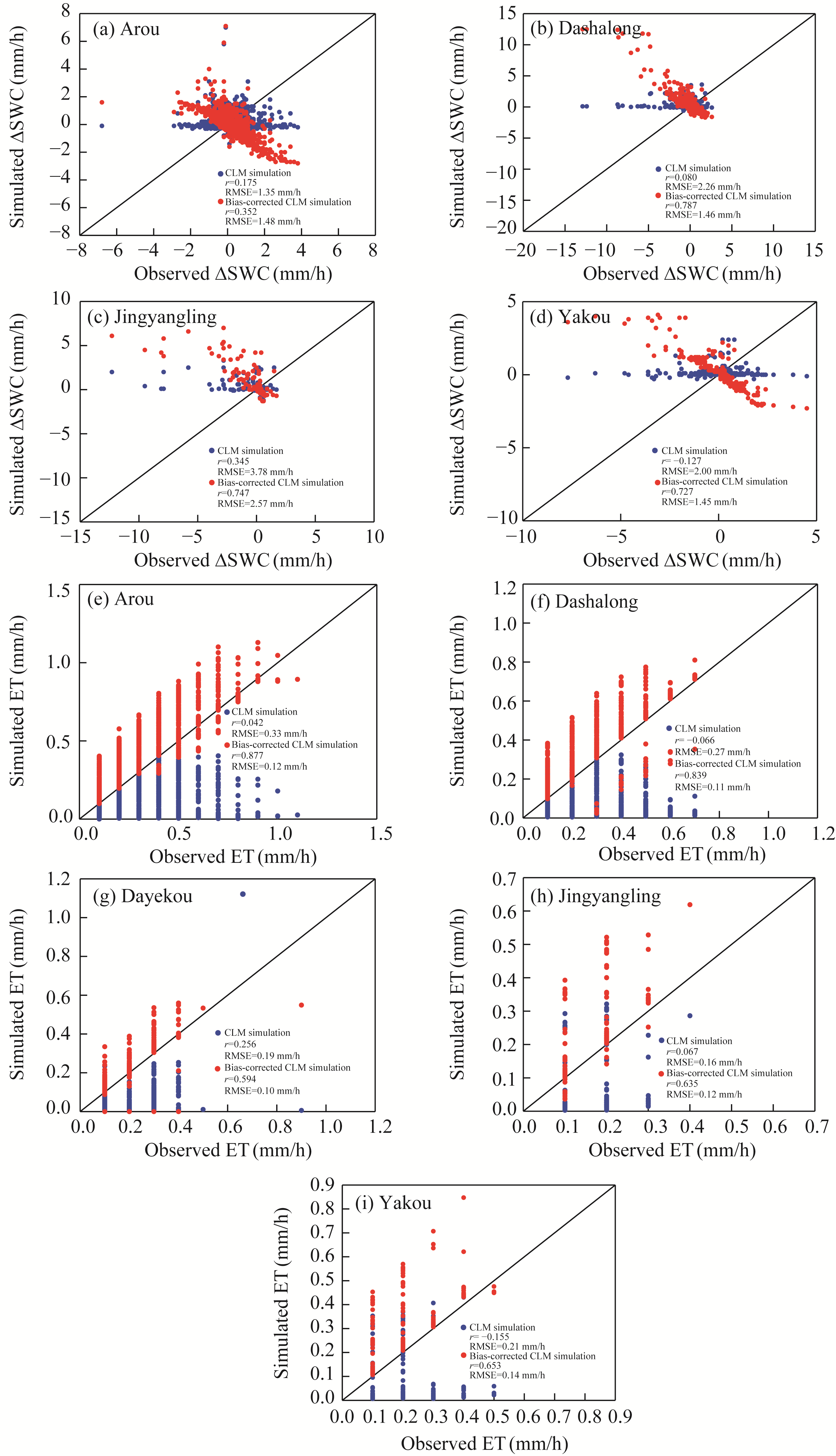 Fig. 7 Simulated results of ΔSWC and ET by CLM and bias corrected CLM. (a-d), ΔSWC at Arou, Dashalong, Jingyangling, and Yakou sites during precipitation process; (e-i), ET at Arou, Dashalong, Dayekou, Jingyangling, and Yakou during ET process. CLM, community land model. |