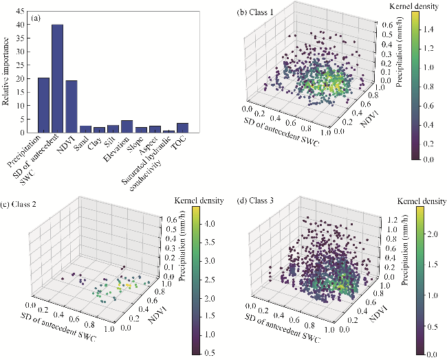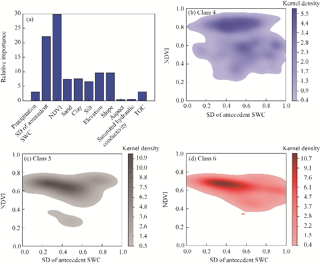 Fig. 3 Environmental factors on subsurface hydrological partitioning classes during precipitation process. (a), relative importance; (b), Class 1; (c), Class 2; (d), Class 3. SD, saturation degree; NDVI, normalized difference vegetation index; TOC, total organic carbon. |