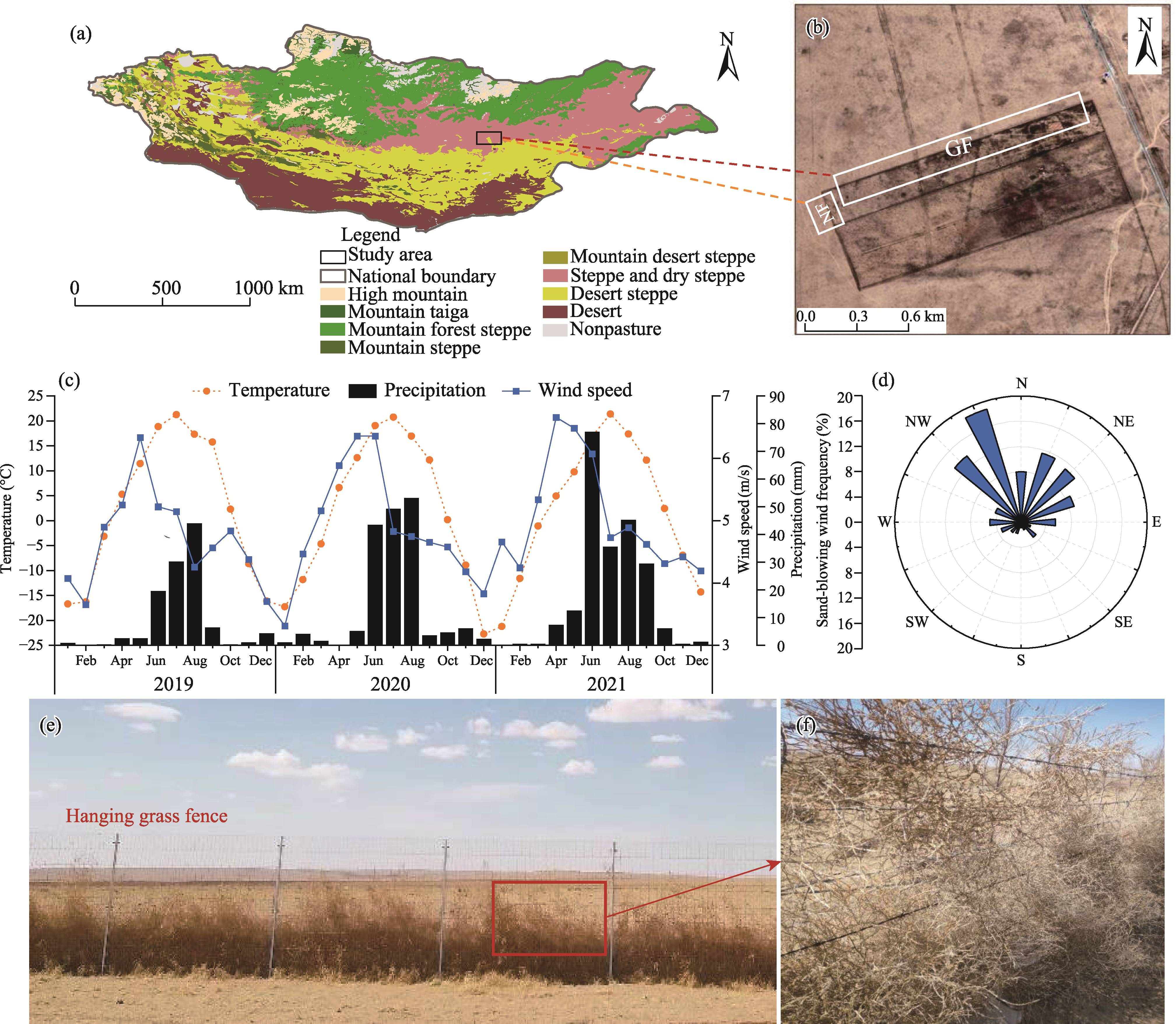 Fig. 1 Overview of the study area, climate characteristics, and hanging grass fences. (a), location of the study area (the study area is located in the ecotone of steppe and desert steppe in Central Mongolia); (b), image showing the experimental design; (c), monthly variations in temperature, precipitation, and wind speed during the sampling period (2019-2021); (d), frequency of sand-driving winds at 10 m in height with wind rose directions; (e), photo showing the hanging grass fence during the grass-withering season (April) in 2019; (f), photo showing the tumbleweeds hanging and accumulating on the fence in April 2019. Note that Figure 1a is based on the standard map (GS(2016)1666) of the Map Service System (http://bzdt.ch.mnr.gov.cn/), and the boundary of the base map has not been modified. The enclosure in Figure 1b is shown in a true-colour image downloaded from Google Earth, including enclosure with hanging grass fences (abbreviated as GF) and enclosure with non-hanging grass fences (abbreviated as NF). N, north; NE, northeast; E, east; SE, southeast; S, south; SW, southwest; W, west; NW, northwest. The abbreviations are the same in the following figures. |