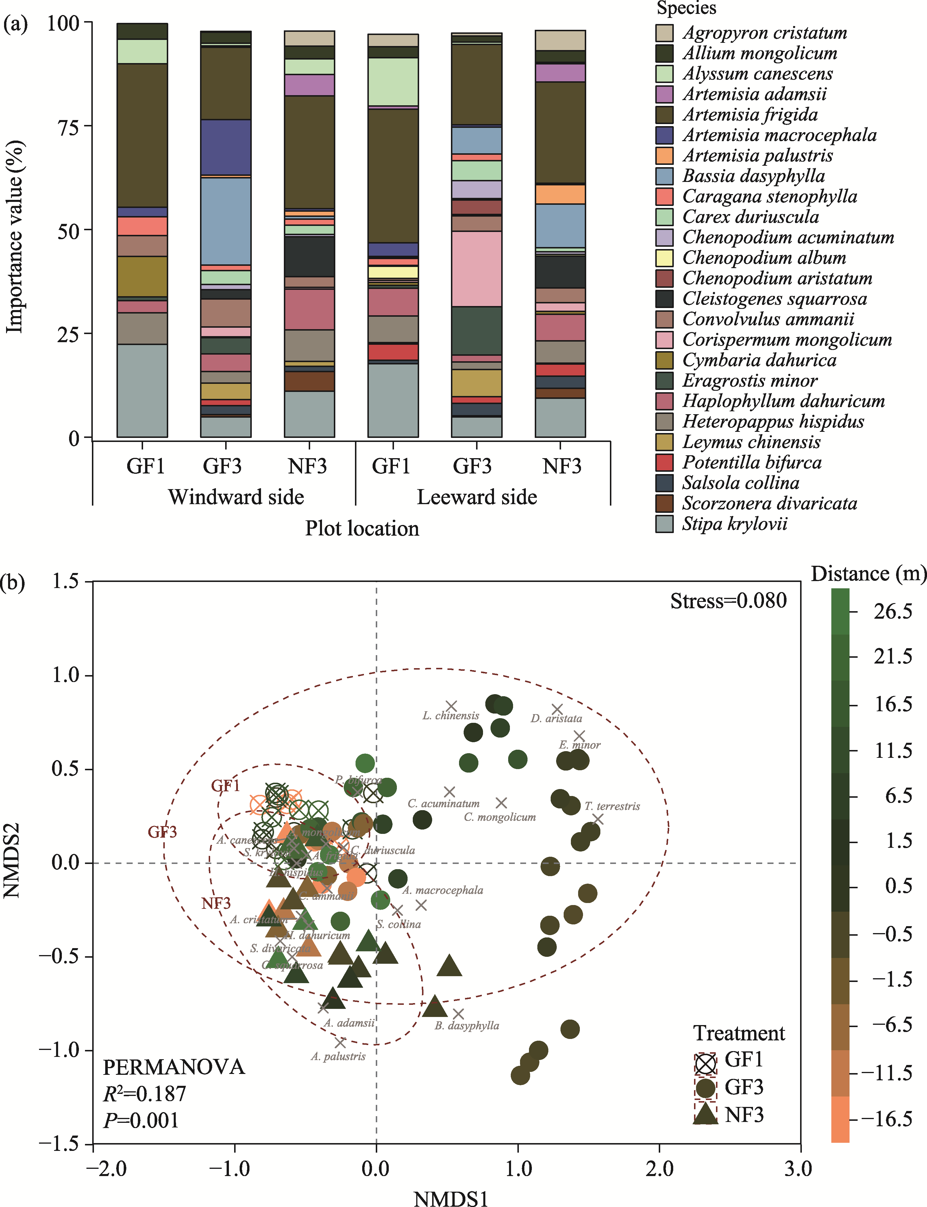 Fig. 3 Responses of species composition to different enclosure treatments (GF1, GF3, and NF3). (a), differences in the importance values of plant species on the windward and leeward sides of fences (the complete data are shown in Tables S1-3); (b), nonmetric multidimensional scaling (NMDS) of species composition, with dispersion ellipses at 95% confidence intervals added. PERMANOVA, permutational multivariate analysis of variance. Ellipse labels represent the 3 enclosure treatments, and the top 20 plant species points in terms of abundance are reflected in the figure. Distance indicates the distance from the sample plots to the fences. |