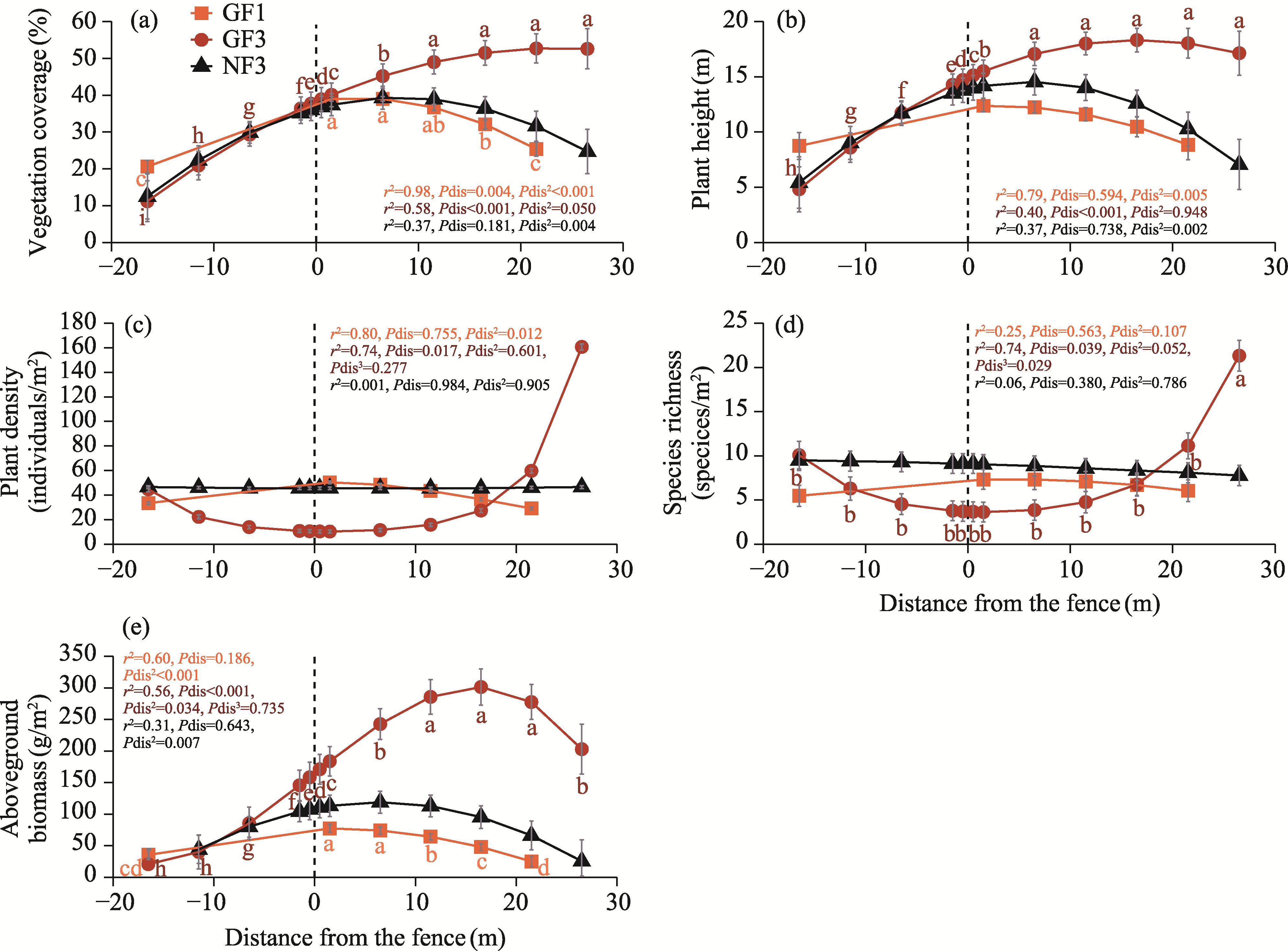 Fig. 4 Comparison of vegetation coverage (a), plant height (b), plant density (c), species richness (d), and aboveground biomass (e) at the interface between the windward and leeward sides of different enclosure treatments. Different lowercase letters indicate significant differences in means (P>0.05). Bars mean standard errors. Positive distances indicate sample plots within the enclosure area on the leeward side of the fences, and negative distances indicate sample plots within the grazing area on the windward side of the fences. Marginal r² refers to the fixed effects only. 'Pdis', 'Pdis2', and 'Ppdis3' represent significance tests for the distance, squared distance, and cubic distance from the fences, respectively. The abbreviations are the same in the following figures. |