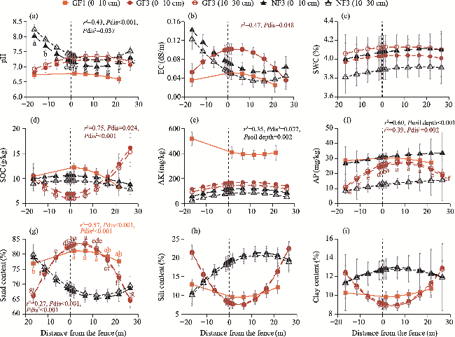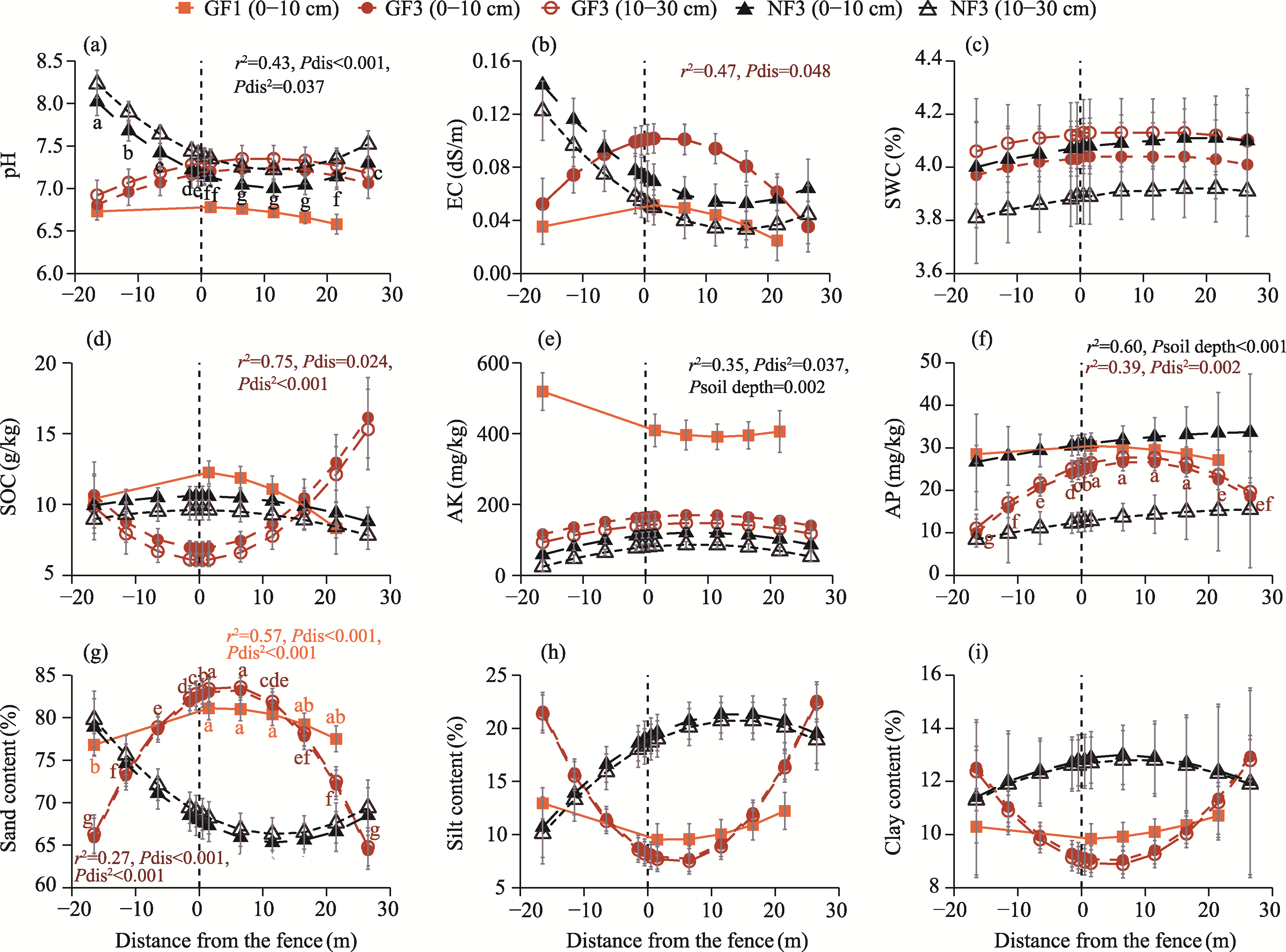 Fig. 5 Comparison of soil physical and chemical properties at the interface between the windward and leeward sides of fences under different enclosure treatments. (a), pH; (b), electrical conductivity (EC); (c), soil water content (SWC); (d), soil organic carbon (SOC) content; (e), available potassium (AK) content; (f), available phosphorus (AP) content; (g), sand content; (h), silt content; (i), clay content. Positive distances indicate sample plots within the enclosure area on the leeward side of the fence, and negative distances indicate sample plots within the grazing area on the windward side of the fence. Different lowercase letters indicate significant differences in means (P>0.05). Bars mean standard errors. Only model r2 values with P<0.05 are labeled in the figure; full model results are provided in Table S4. 'Psoil depth' indicates the significance of soil depth on soil physical and chemical properties. The abbreviations are the same in the following figures. |