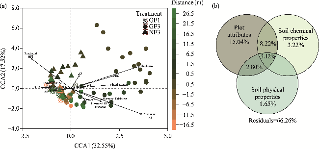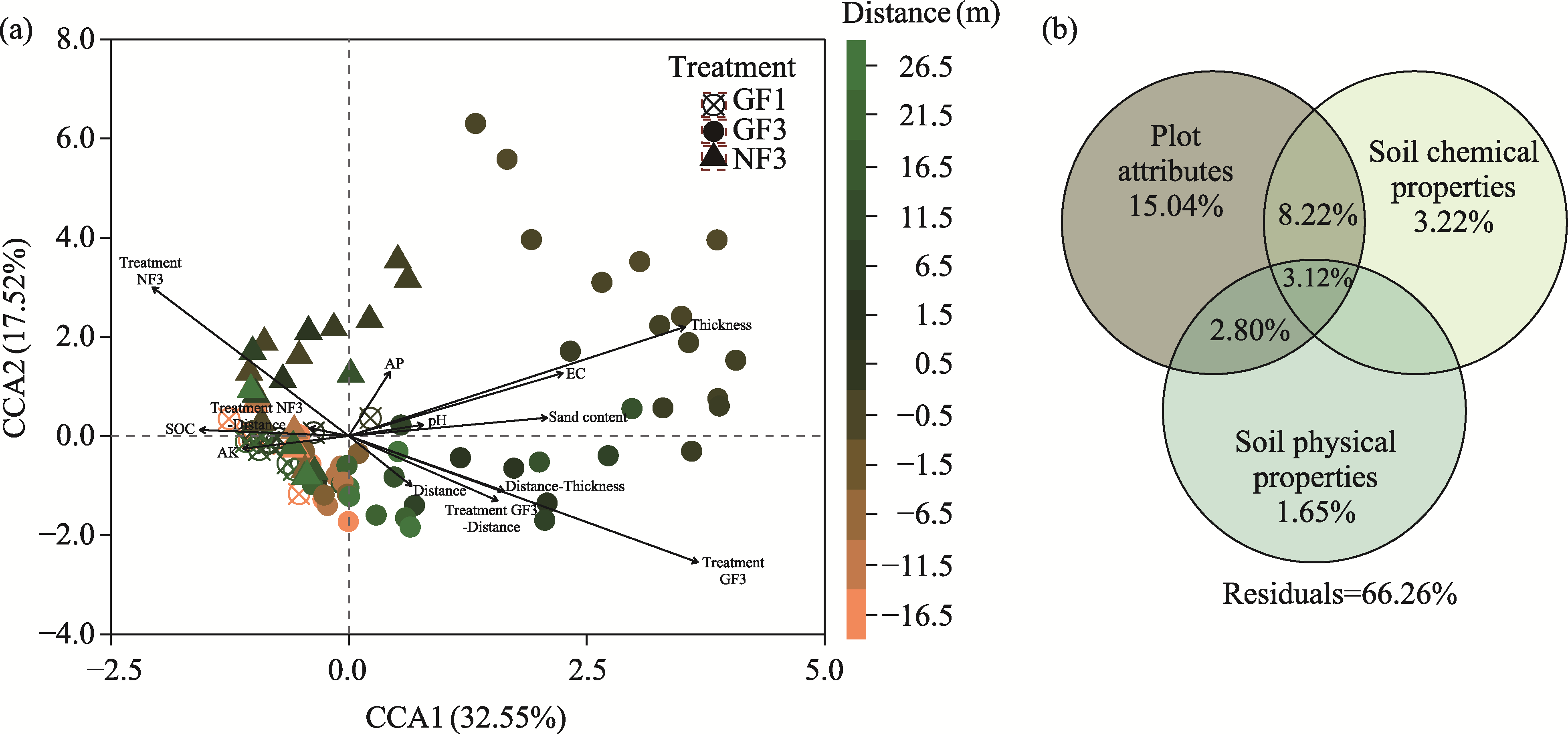 Fig. 6 Impacts of different environmental factors on species composition. (a), canonical correspondence analysis (CCA) of species composition at varying distances from the fence under different enclosure treatments; (b), contributions of different groups of environmental factors to species composition calculated by variation partitioning. Arrows represent the nine significant environmental factors selected for forward selection. "Treatment" represents the three different enclosure treatments: GF1, GF3, and NF3. "Thickness" denotes sand accumulation thickness. "Distance-Thickness" represents the interaction between distance from the fence and sand accumulation thickness. Note that factors with contributions to the total variance less than 0.0 are not shown. |