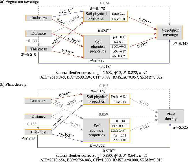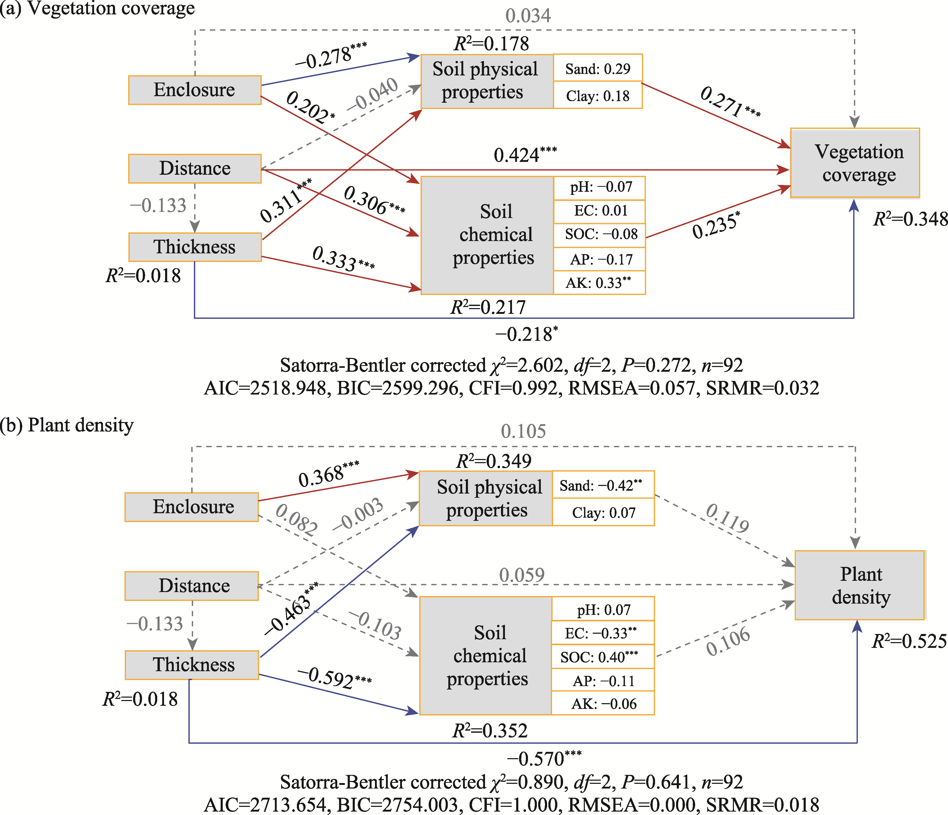 Fig. 7 Impacts of different environmental factors on vegetation coverage (a) and plant density (b) based on structural equation modelling (SEM). Boxes represent the environmental factors included in the model. Arrows indicate the paths, with the numbers on the paths representing standardized regression weights (the thicker the lines, the greater the weights). Solid arrows represent significant paths, with red solid arrows indicating positive effects, blue solid arrows indicating negative effects, and grey dashed arrows indicating non-significant paths. The significances along the paths at P<0.05, P<0.01, and P<0.001 levels are indicated by *, **, and ***, respectively. The standardized estimates and significance are displayed within each soil physical and chemical property box. The total explained variance of the environmental factors (R²) is marked near the box. χ2, chi-square; df, degree of freedom; n, sample size; AIC, Akaike information criterion; BIC, Bayesian information criterion; CFI, comparative fit index; RMSEA, root mean square error of approximation; SRMR, standardized root mean square residual. |
