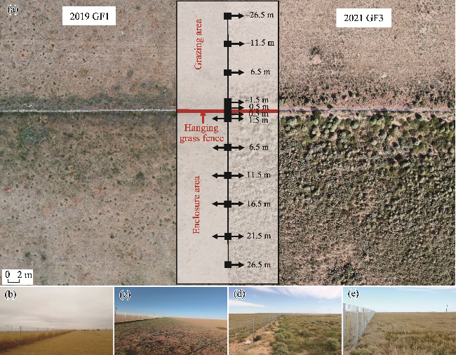 Fig. 2 Experimental design and sampling locations for vegetation and soil survey. (a), drone images showing example locations of transects and sample plots; (b), photo showing vegetation recovery during the early formation of the hanging grass fences in April 2019; (c), photo showing the regreening of the grassland in August 2019 for the first year of enclosure with hanging grass fences (GF1); (d), photo showing the regreening of the grassland in August 2021 for the third year of enclosure with hanging grass fences (GF3); (e), photo showing the third year of enclosure with non-hanging grass fences (NF3). Positive distances indicate sample plots within the enclosure area on the leeward side of the fences, and negative distances indicate sample plots within the grazing area on the windward side of the fences. The abbreviations are the same in the following figures. |