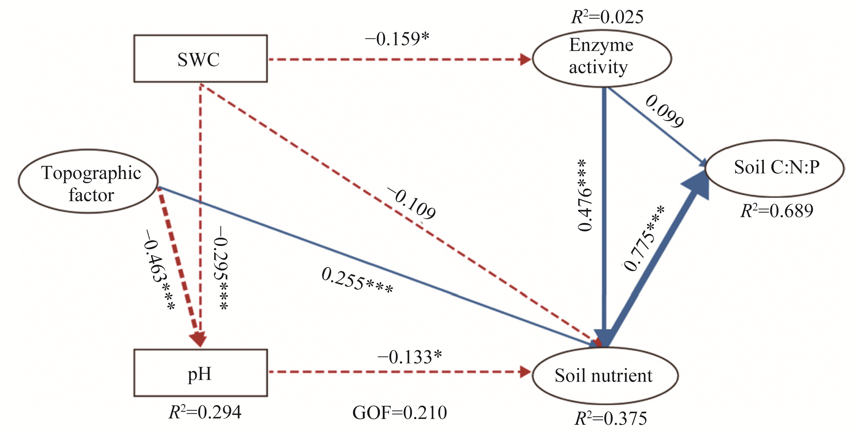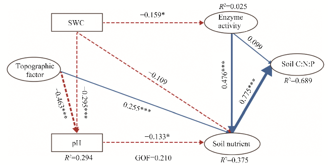 Fig. 6 Partial least squares structural equation model (PLS-SEM) result for influencing factors on soil chemical stoichiometry. GOF, goodness-of-fit; *, P<0.050 level, ***, P<0.001 level. |
