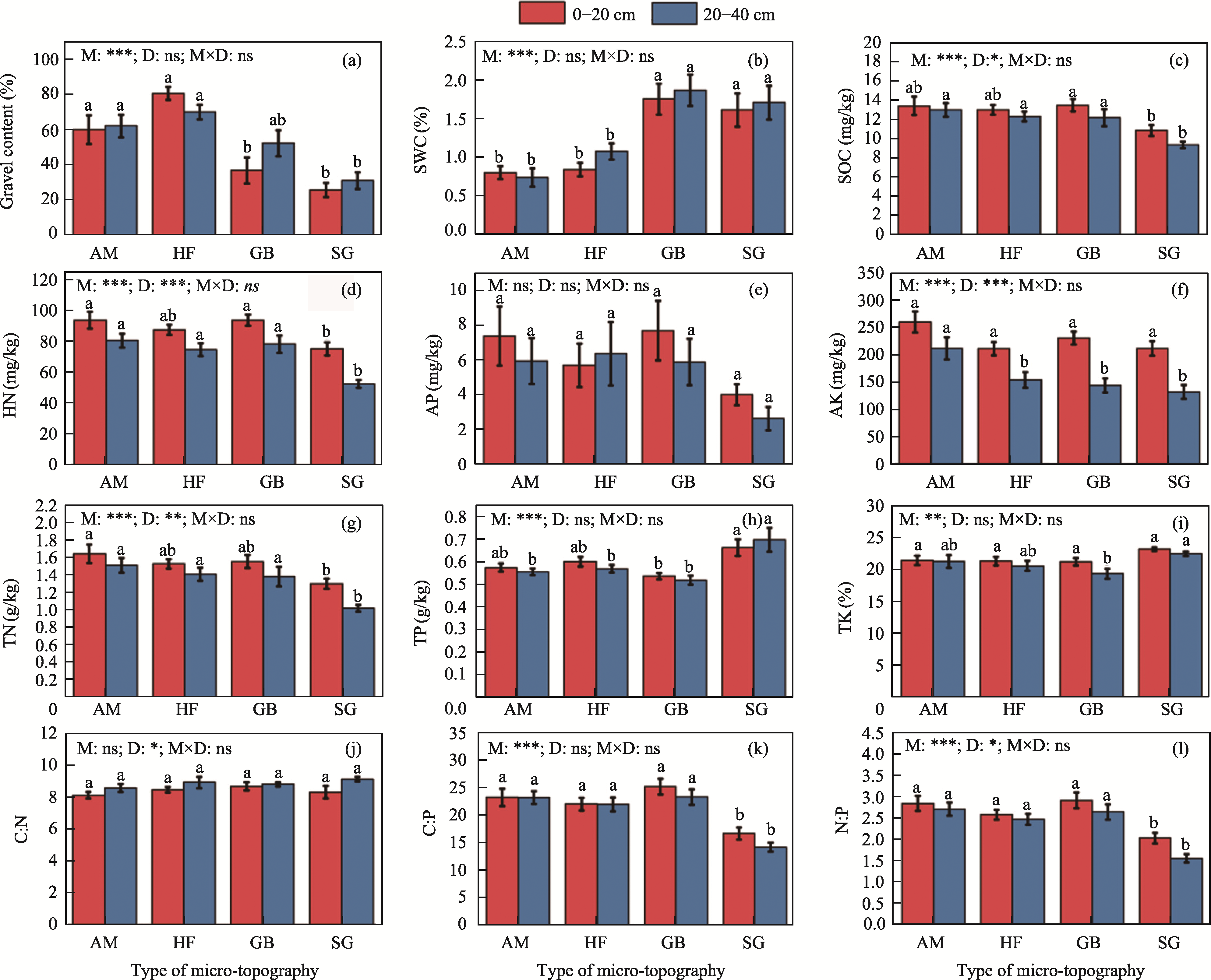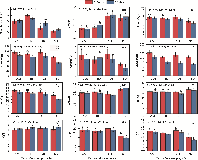 Fig. 2 Soil physical-chemical parameters (a-i) and stoichiometric ratios (j-l) in different micro-topographies and soil depths. M, micro-topography; D, soil depth; M×D, interaction between micro-topography and depth. AM, alluvial mesas; HF, high floodplain; GB, groove beach; SG, striated groove. Different lowercase letters represent significant differences in the same soil depth among different micro-topography at P<0.050 level. ***, P<0.001 level; **, P<0.010 level; *, P<0.050 level; ns, no significant difference. The abbreviations are the same as in the following figures. |
