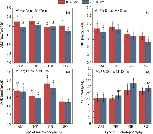 Fig. 3 Soil enzyme activity in different micro-topographies and soil depths. (a), ALP (alkaline phosphatase); (b), URE (urease); (c), POD (peroxidase); (d), CAT (catalase). Different lowercase letters represent significant differences at the same soil depth among different micro-topographies at P<0.050 level. **, P<0.010 level; ns, no significant difference. |