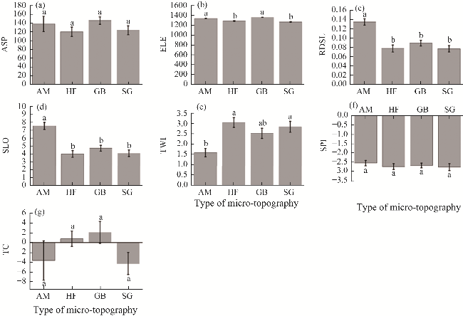 Fig. 4 Differences of topographic factors among different micro-topographies. (a), ASP (slope aspect); (b), ELE (elevation); (c), RDSL (relief degree of land surface); (d), SLO (slope); (e), TWI (topographic wetness index); (f), SPI (stream power index); (g), TC (terrain curvature). Different lowercase letters represent significant differences in environmental indicators among different micro-topographies at P<0.050 level. The abbreviations are the same in the following figures. |