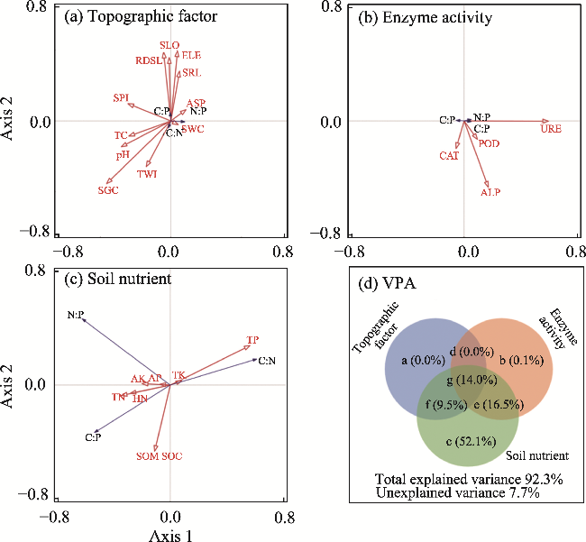 Fig. 5 Redundancy analysis (RDA) and variance partitioning analysis (VPA) between soil ecological stoichiometry and their influencing factors. (a), topographic factor; (b), enzyme activity; (c), soil nutrient; (d), VPA. In Figure 5d, a, b, and c are topographic factor, enzyme activity, and soil nutrient, respectively; d is the interaction between a and b; e is the interaction between b and c; f is the interaction between a and c; and g is the interaction among a, b, and c. |