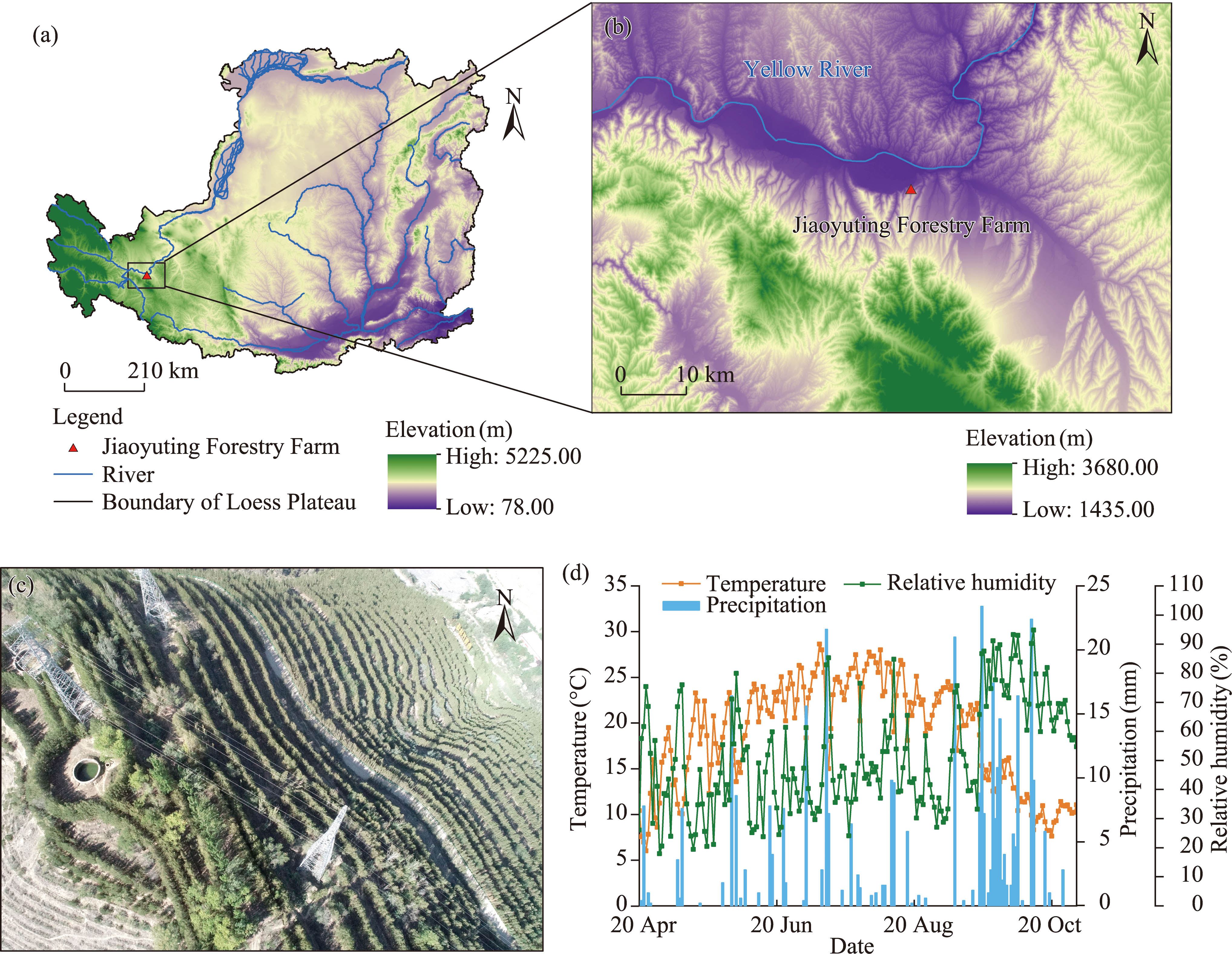 Fig. 1 Geographical location, landscape, and climate of the Jiaoyuting Forestry Farm. (a and b), location of the Jiaoyuting Forestry Farm in the Loess Plateau; (c), unmanned aerial vehicle (UAV) landscape of the Jiaoyuting Forestry Farm; (d), daily temperature, precipitation, and relative humidity during the study period. The flight height of the UAV is 200.00 m. |