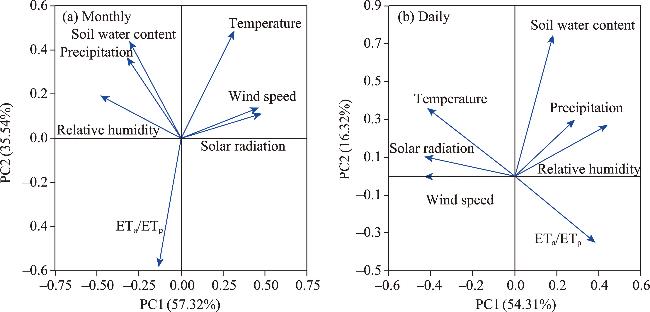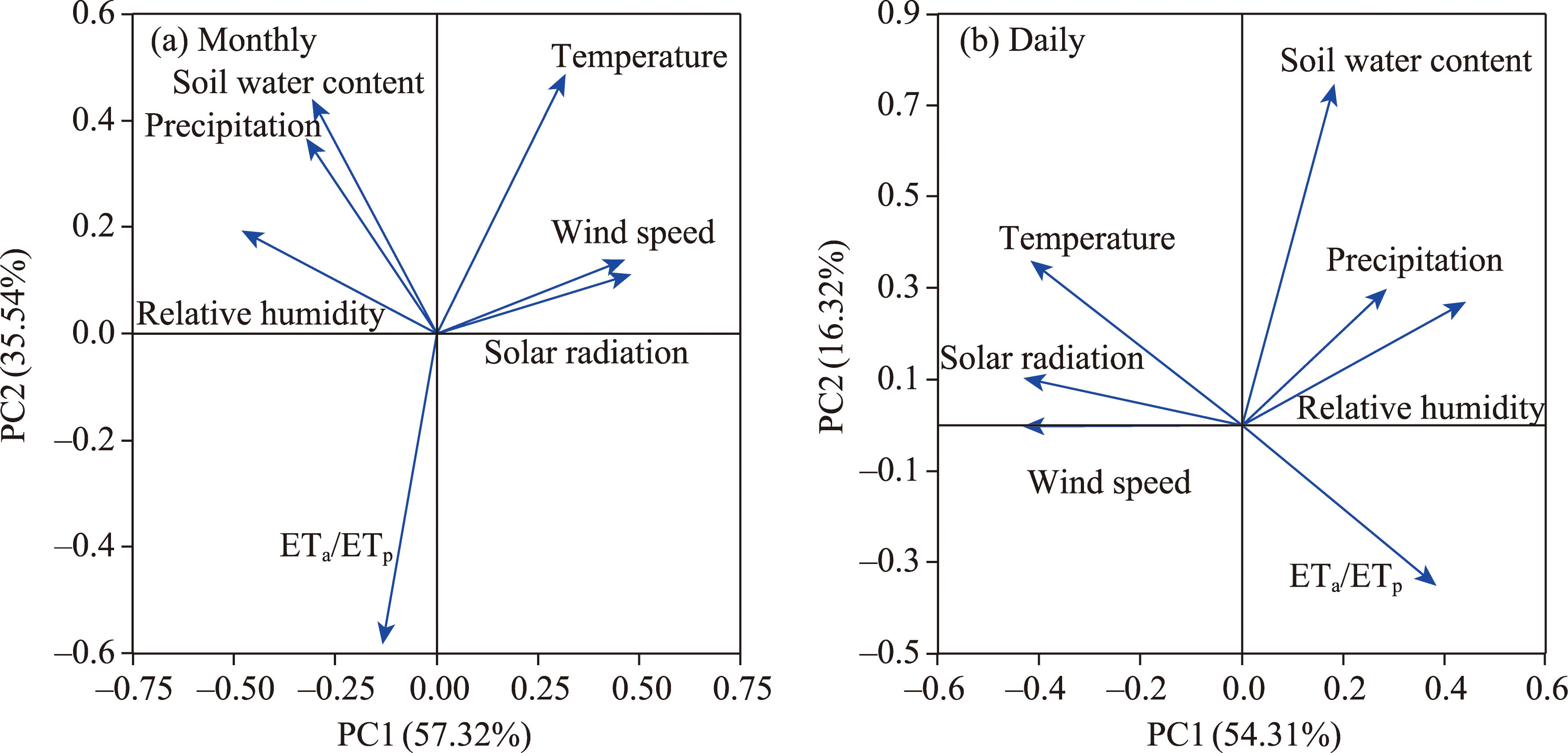 Fig. 10 PCA load diagram of influence factors of ETa/ETp on the monthly (a) and daily (b) scales |