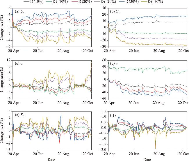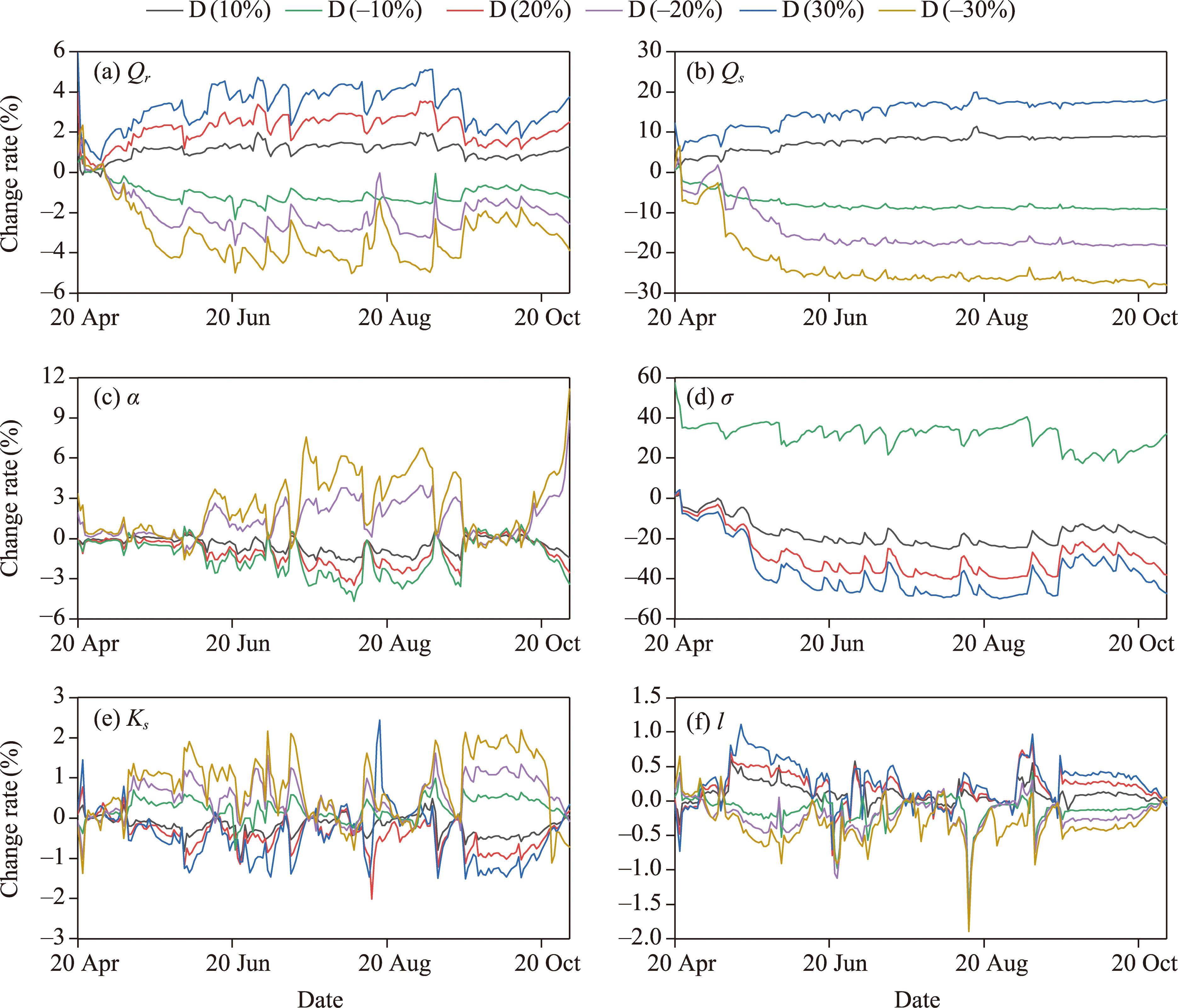 Fig. 3 Change rate of simulation results under different parameter perturbations. (a), Qr; (b), Qs; (c), α; (d), σ; (e), Ks; (f), l. Qr, soil residual water content; Qs, soil saturated water content; Ks, saturated hydraulic conductivity; α, reciprocal of the soil intake value; σ, soil pore-size distribution parameter; l, pore-connectivity parameter. The change rates of simulation results were same when the perturbation degree of Qs was at 20.00% and 30.00%, so the Figure 3b only shows five perturbations. The change rates of simulation results were same when the perturbation degree of α was at -10.00% and 30.00%, so the Figure 3c also shows five perturbations. Due to the limitation of parameter value range, perturbation degree of σ cannot set to -20.00% and -30.00%, the Figure 3d only shows four perturbations. |