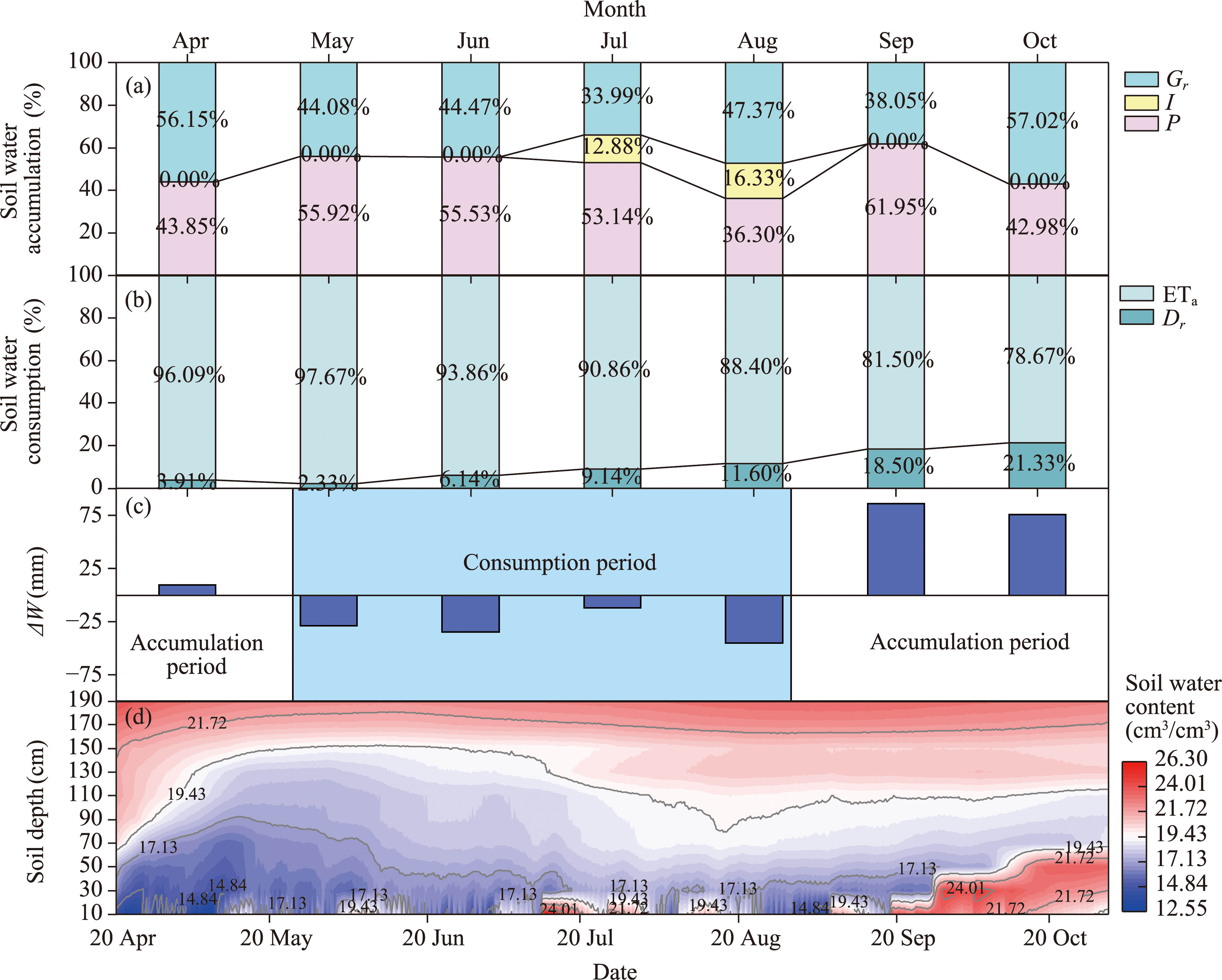 Fig. 4 Soil water budget and dynamic changes simulated by HYDRUS-1D model. (a), soil water accumulation; (b), soil water consumption; (c), variation of soil water storage (ΔW); (d), change of soil water content. P, amount of precipitation; Gr, upward recharge of deep soil water below the rhizosphere; I, amount of irrigation; ETa, actual evapotranspiration; Dr, deep percolation. |