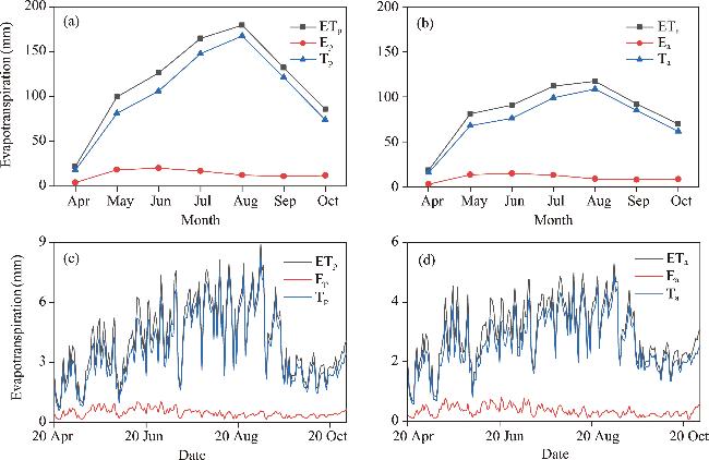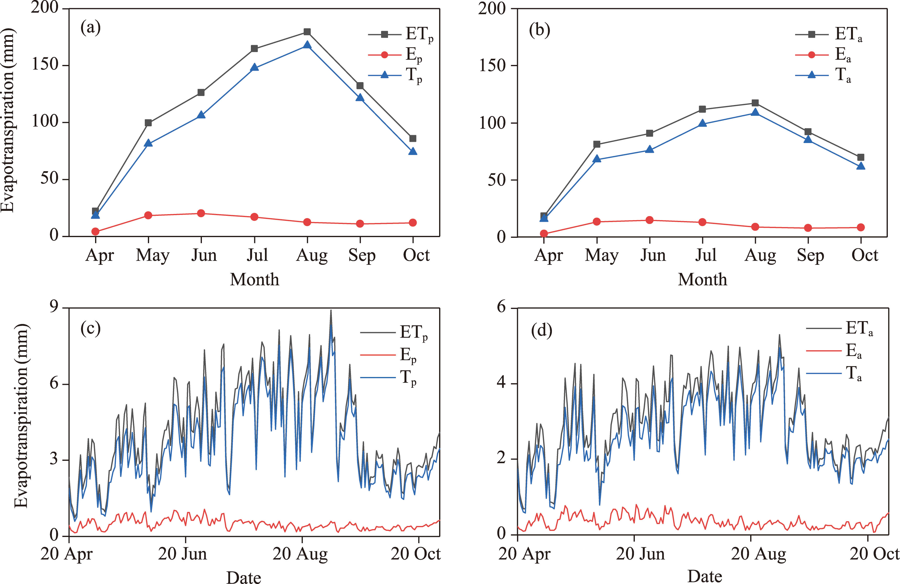 Fig. 5 Dynamic change of evapotranspiration on the monthly (a and b) and daily (c and d) scales. ETp, potential evapotranspiration; Ep, potential evaporation; Tp, potential transpiration; Ea, actual evaporation; Ta, actual transpiration. |