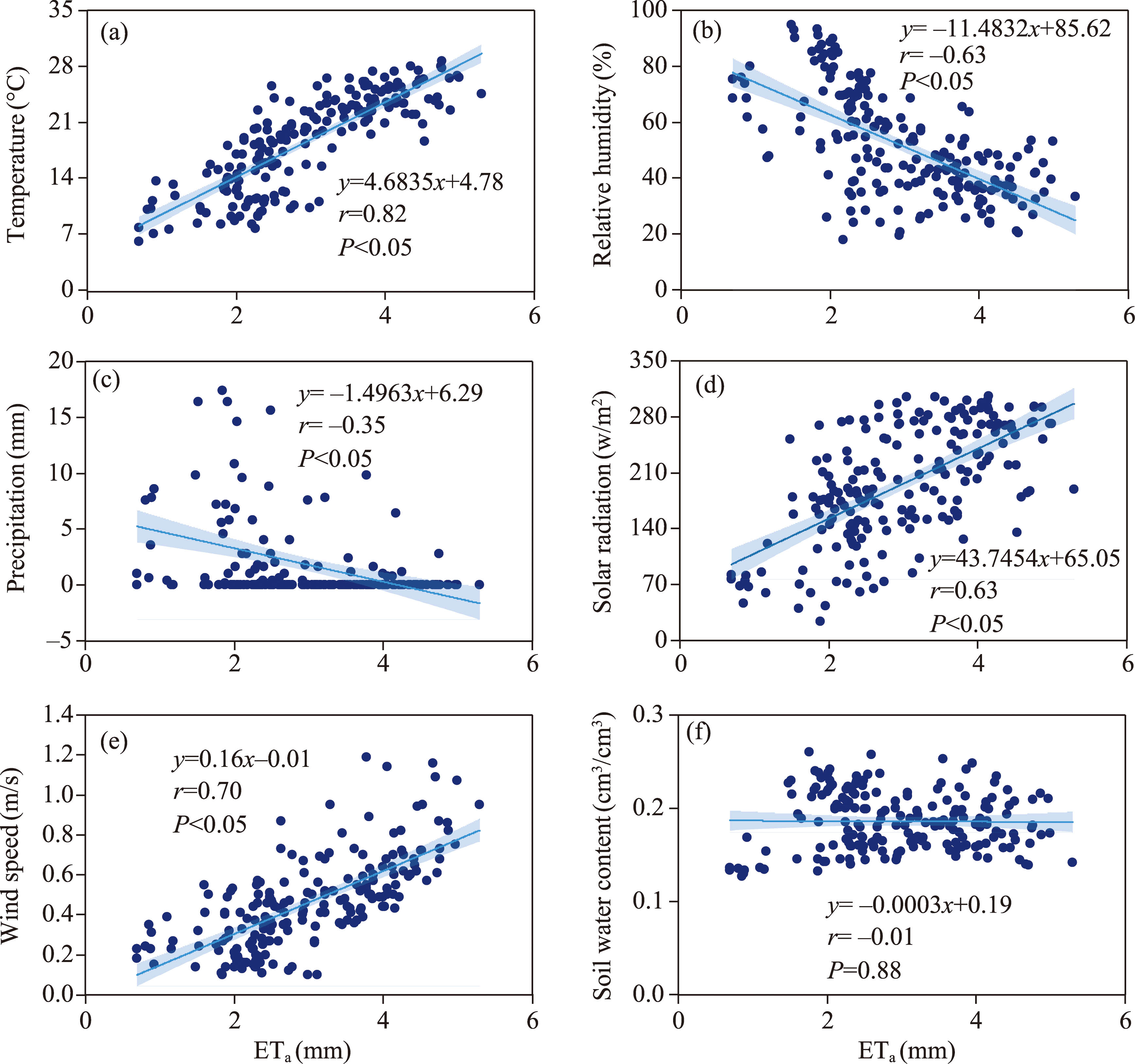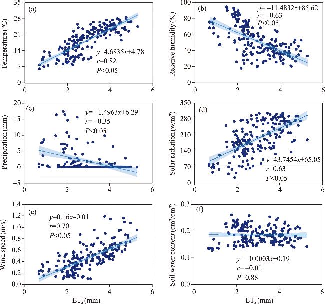 Fig. 9 Correlation analysis between ETa and environmental factors on the daily scale. (a), temperature; (b), relative humidity; (c), precipitation; (d), solar radiation; (e), wind speed; (f), soil water content. The light blue area that is symmetric on both sides of function represents the 95% confidence interval. |