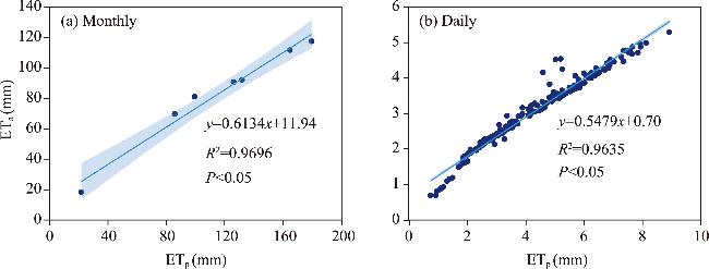 Fig. 6 Relationship between ETp and ETa on the monthly (a) and daily (b) scales. The light blue area that is symmetric on both sides of function represents the 95% confidence interval. |
