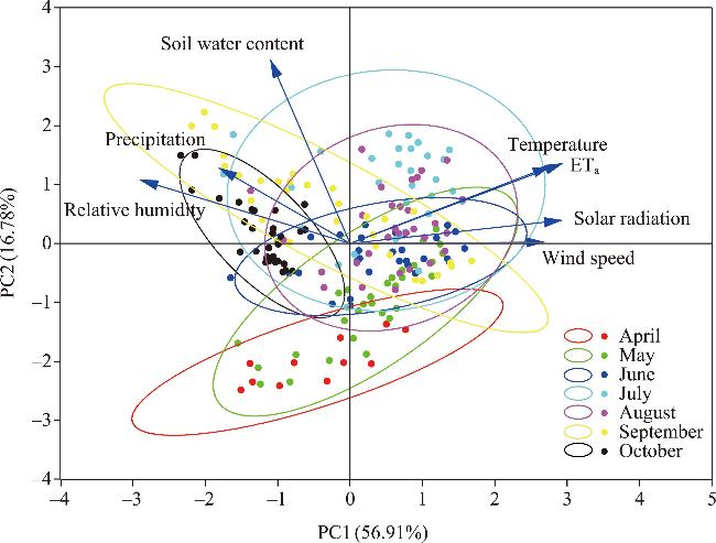 Fig. 8 Principal component analysis (PCA) diagram of influence factors of ETa. The ellipse represents 95.00% confidence ellipse, and its color is same with the points of the same month. PC, principal component. |