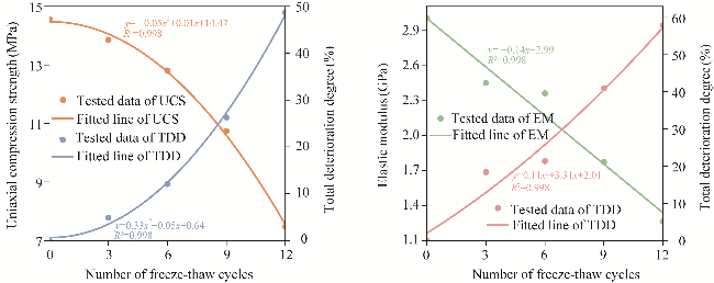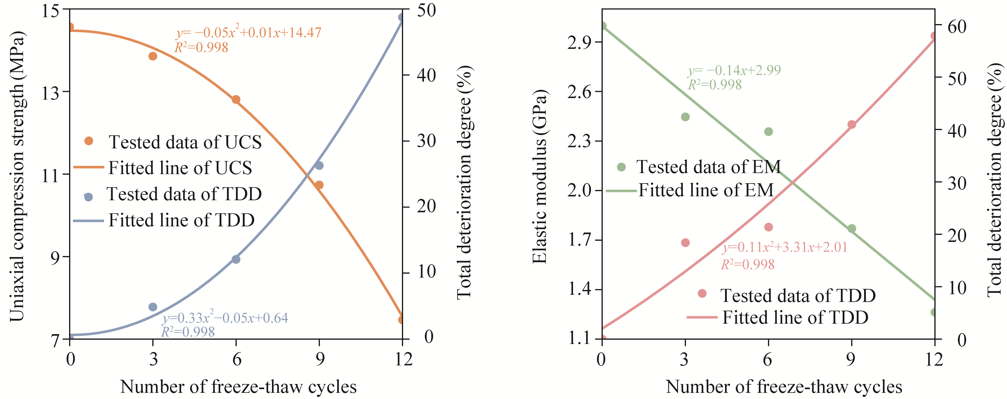 Fig. 10 Trends of peak strength (a) and elastic modulus (b) of sandstone under freeze-thaw cycles. UCS, uniaxial compression strength; TDD, total deterioration degree; EM, elastic modulus. |