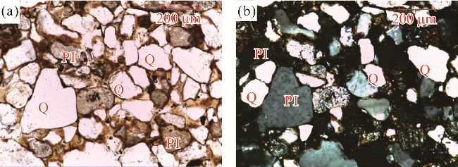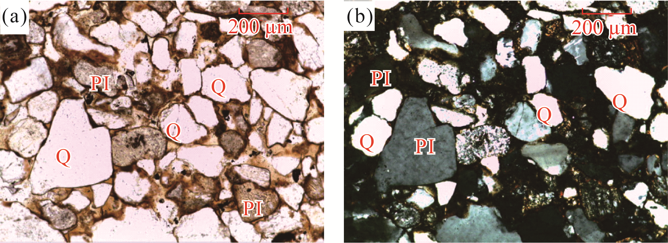 Fig. 3 Microscopic characterization of sandstones in the Lower Cretaceous Luohe Formation. (a), single polarized photo; (b), orthogonal polarizer photo. PI, feldspar; Q, quartz. |