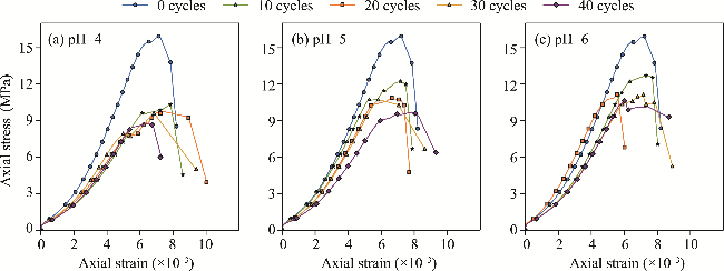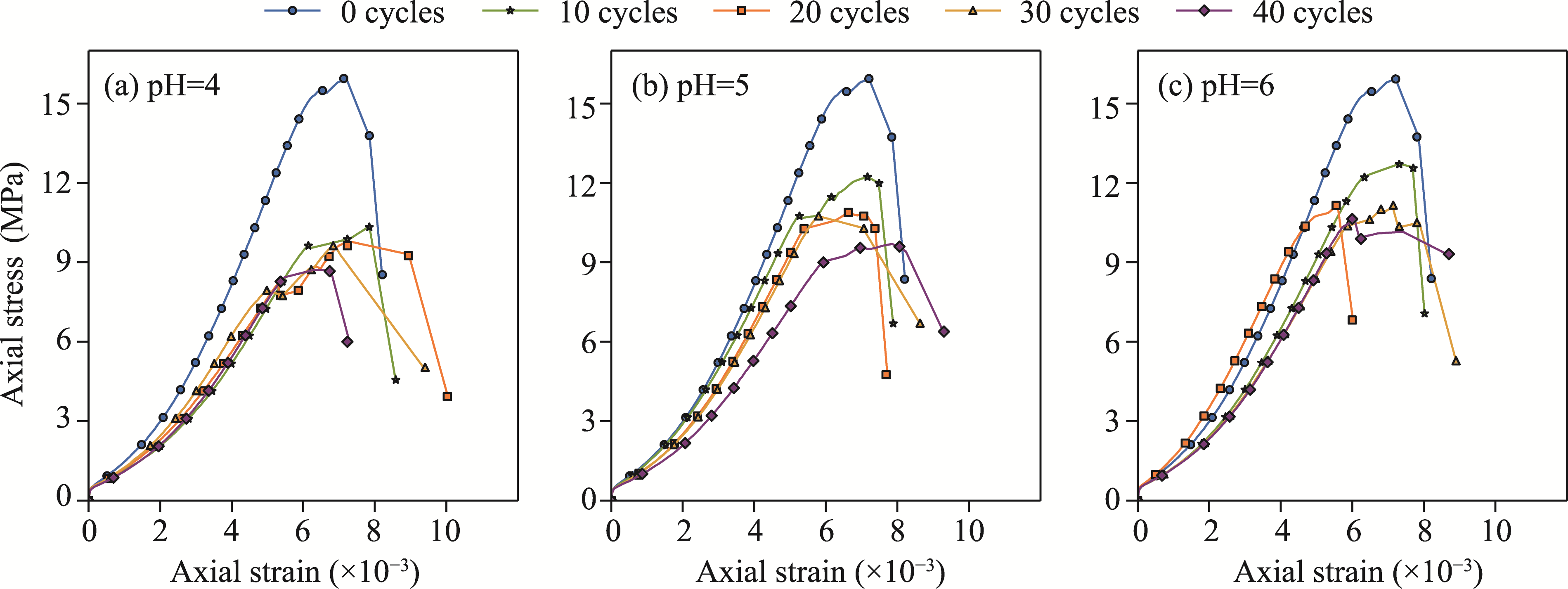 Fig. 5 Stress-strain curves of sandstone under different dry-wet cycles and acidic environments. (a), pH=4; (b), pH=5; (c), pH=6. |