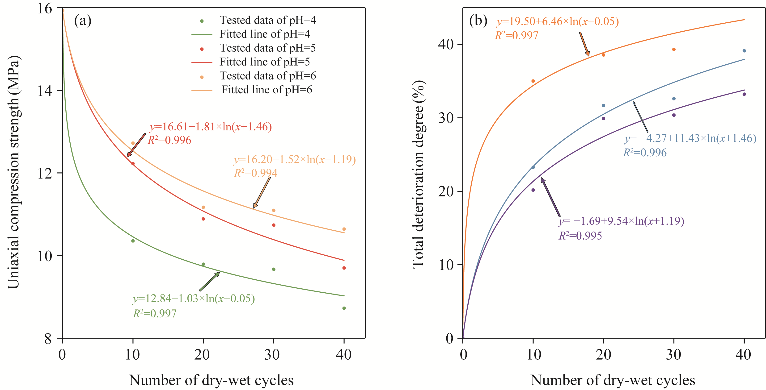 Fig. 6 Trends of uniaxial compression strength (a) and total deterioration degree (b) under acidic dry-wet cycles |