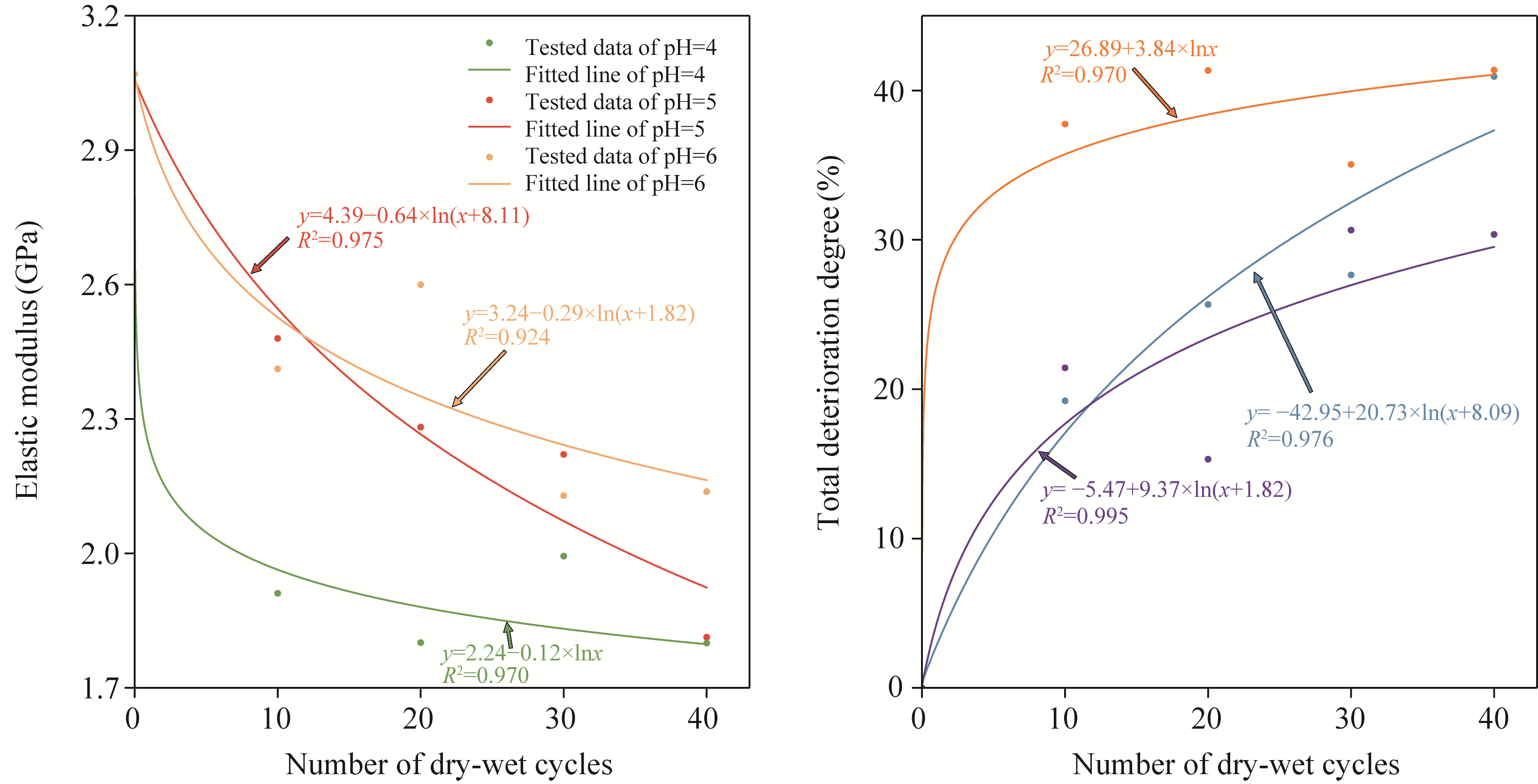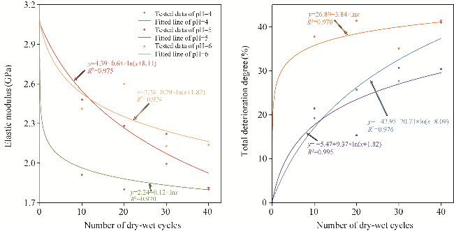 Table 4 Peak strength and modulus of elasticity of sandstones under acidic wet-dry cycles |