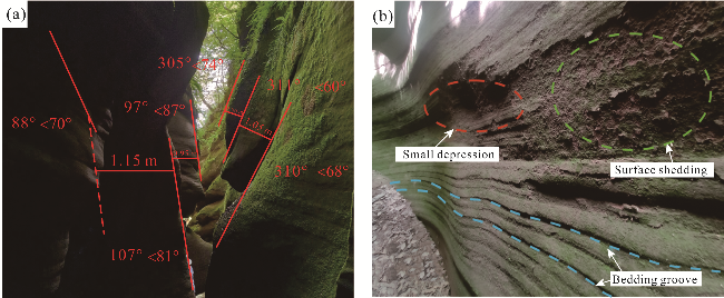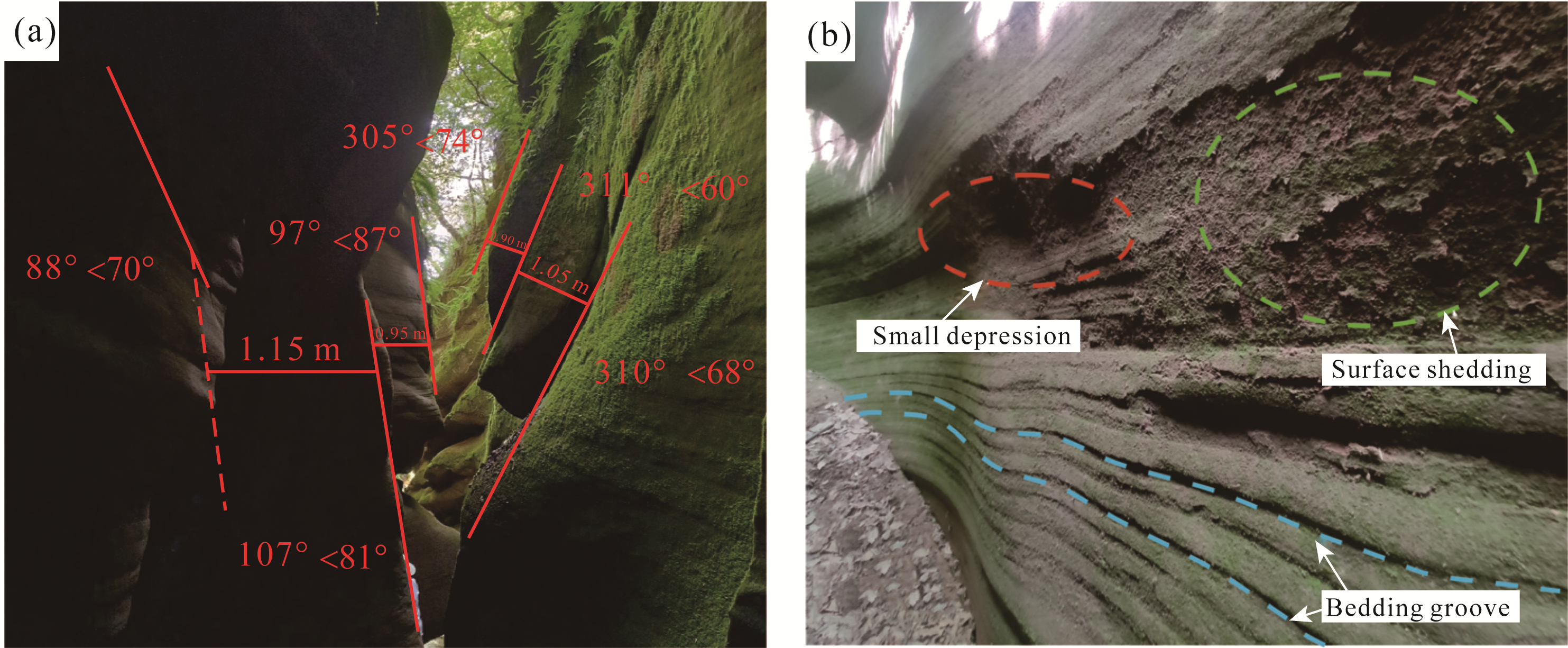 Fig. 8 Slit-type Danxia landform rock echelon joints (a) and bryophyte-attached rock walls (b) |
