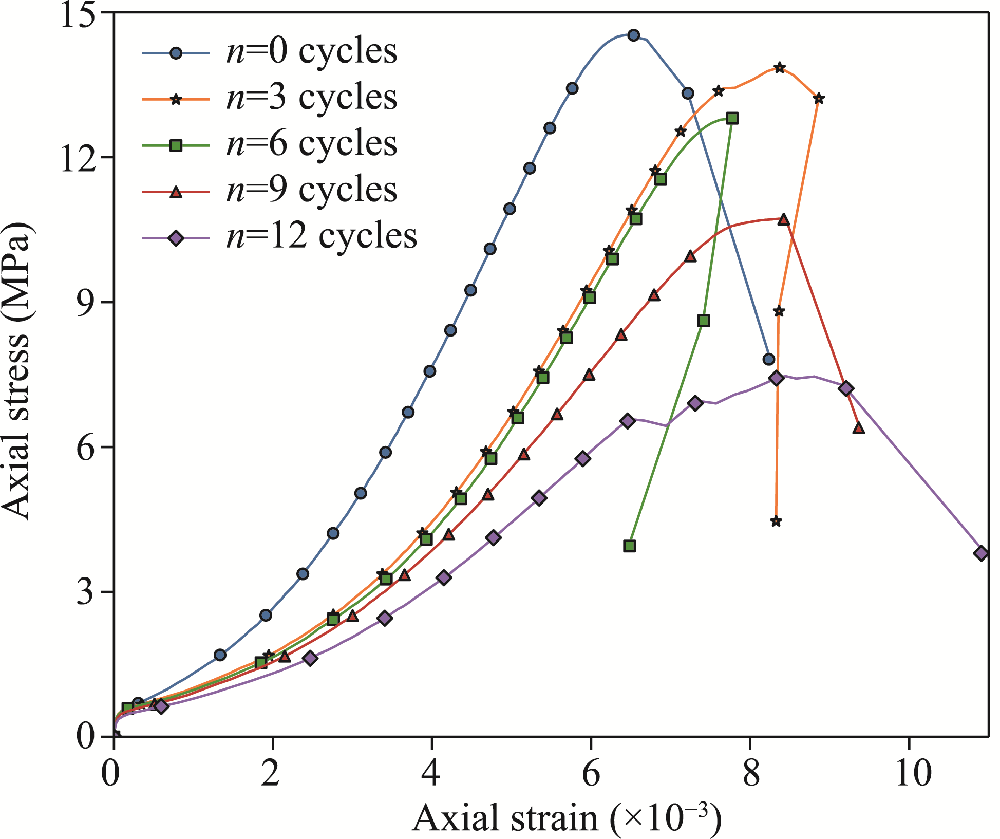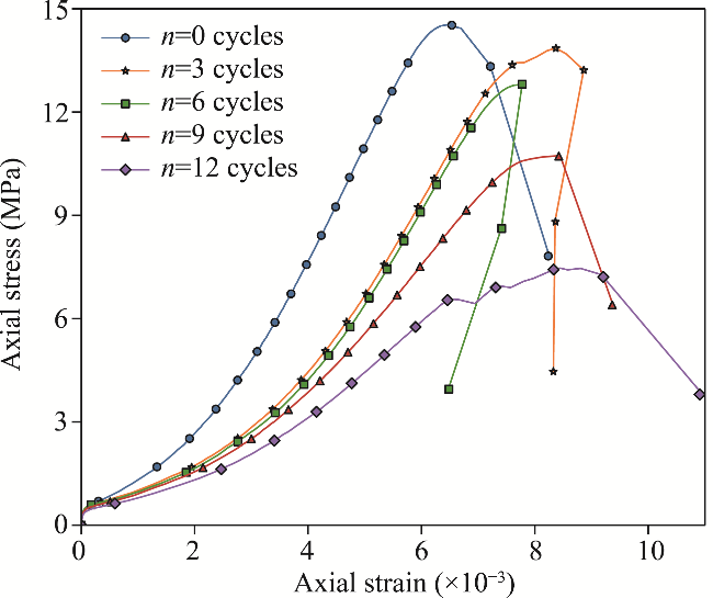 Fig. 9 Uniaxial stress-strain curves of sandstone under freeze-thaw cycles. n is the number of freeze-thaw cycles. |