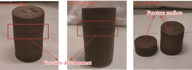 Fig. 11 Growth and development of cracks in rocks during freeze-thaw cycles. (a), 3 cycles; (b), 6 cycles; (c), 9 cycles. |