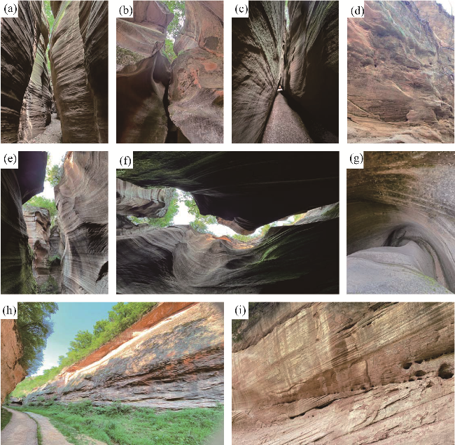 Fig. 2 Danxia landform landscape of the Ganquan canyon group. (a), Huabaocha Gully; (b), Mudan Gully; (c), Yixiantian Gully; (d), Longbagou Gully; (e and f), Huashu Gully; (g), kettle caves; (h), red cliffs; (i), micro-geomorphology. |