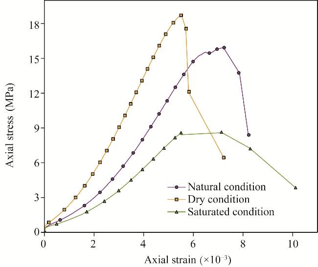 Fig. 4 Comparison of uniaxial stress-strain curves under natural, dry, and saturated conditions |
