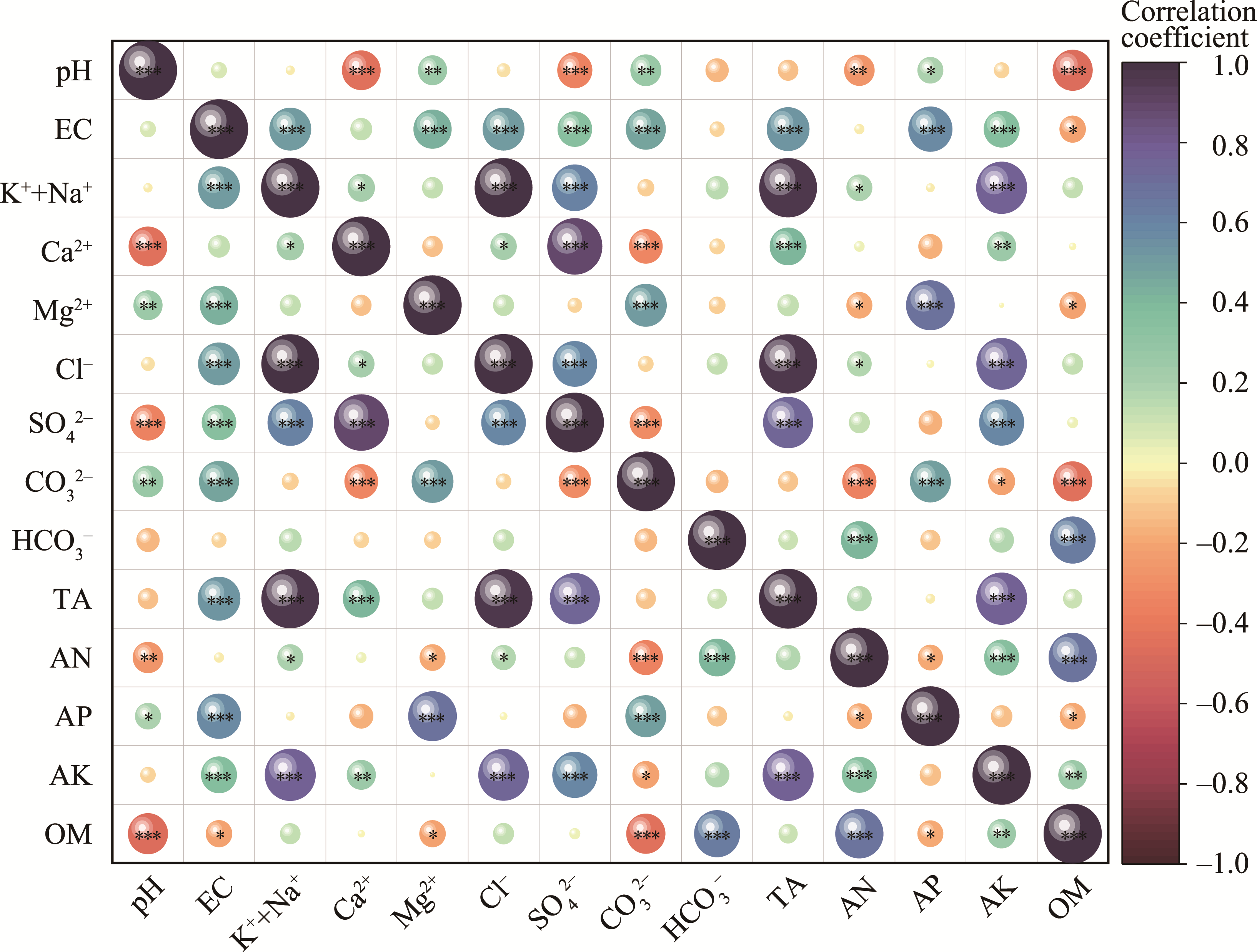 Fig. 11 Pearson correlation matrix of soil salinity and nutrient in the study area. *, P≤0.050; **, P≤0.010; ***, P≤0.001. |