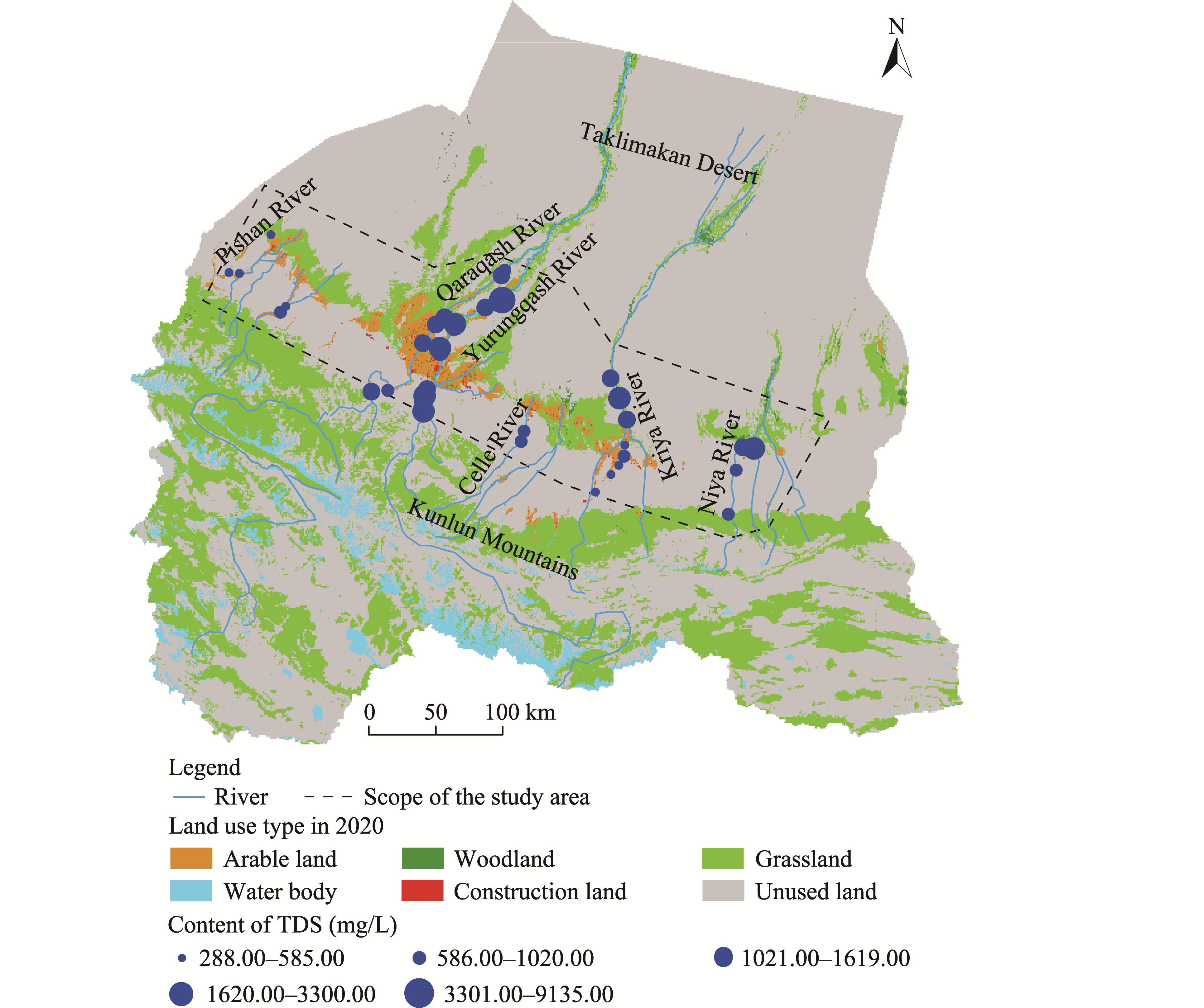 Fig. 2 Spatial distribution of the total dissolved solids (TDS) of surface water in the study area |