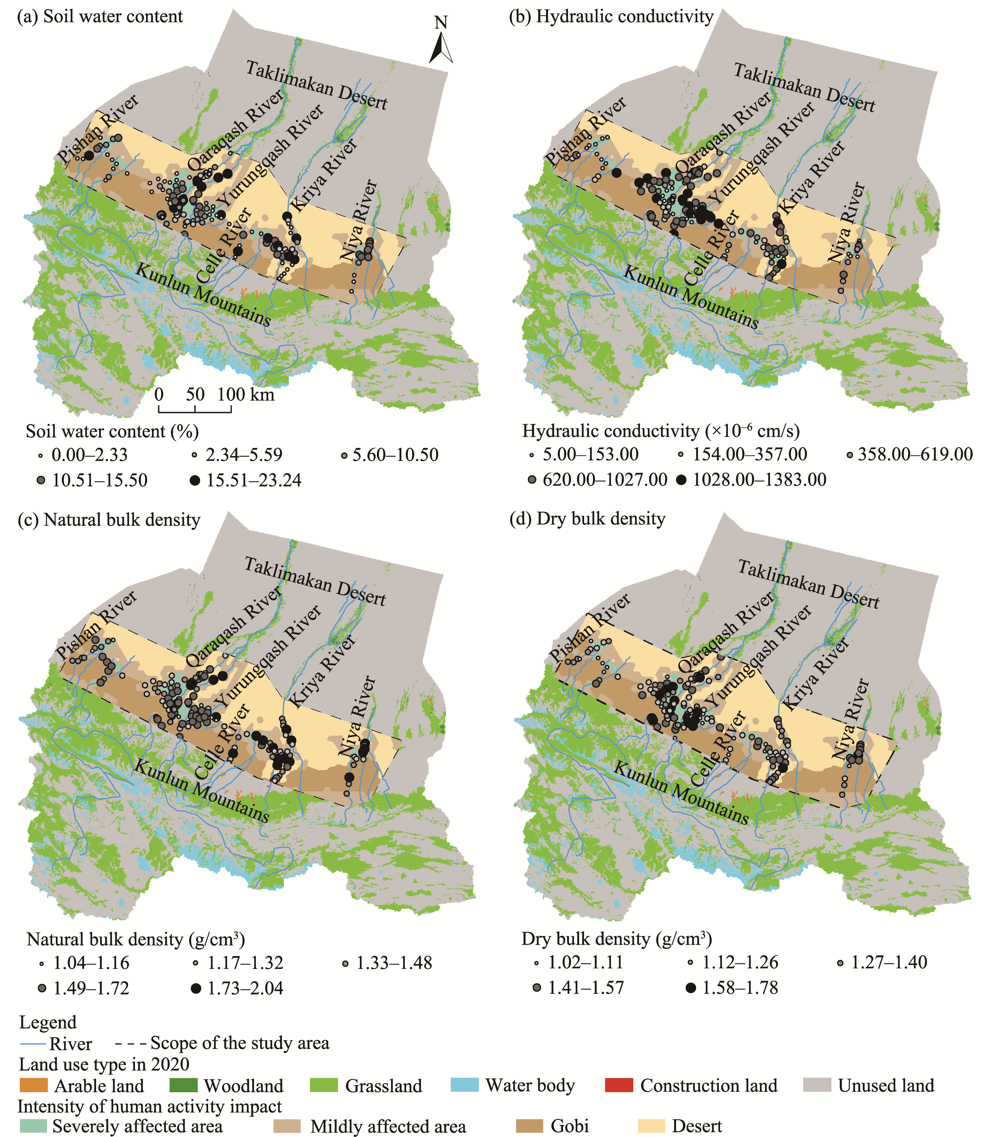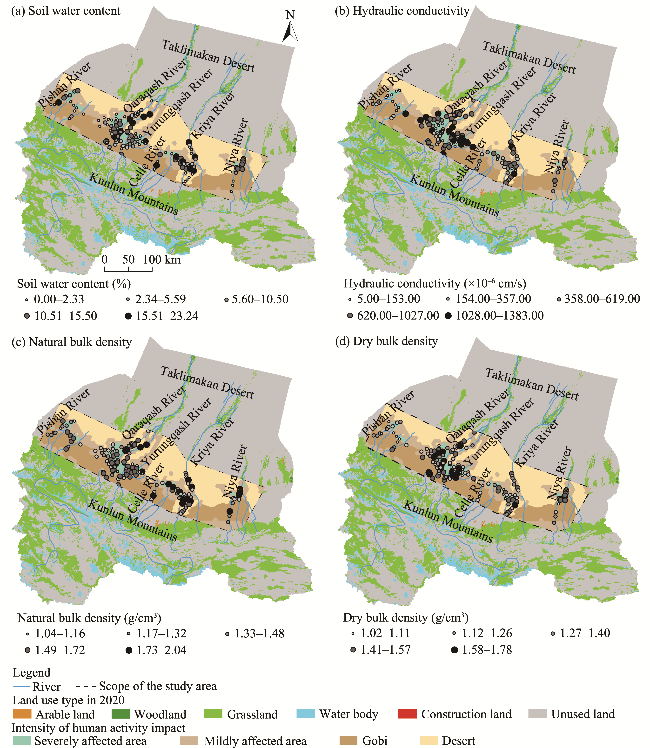 Fig. 3 Spatial distribution of soil physical and chemical property parameters in the study area. (a), soil water content; (b), hydraulic conductivity; (c), natural bulk density; (d), dry bulk density. |