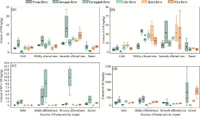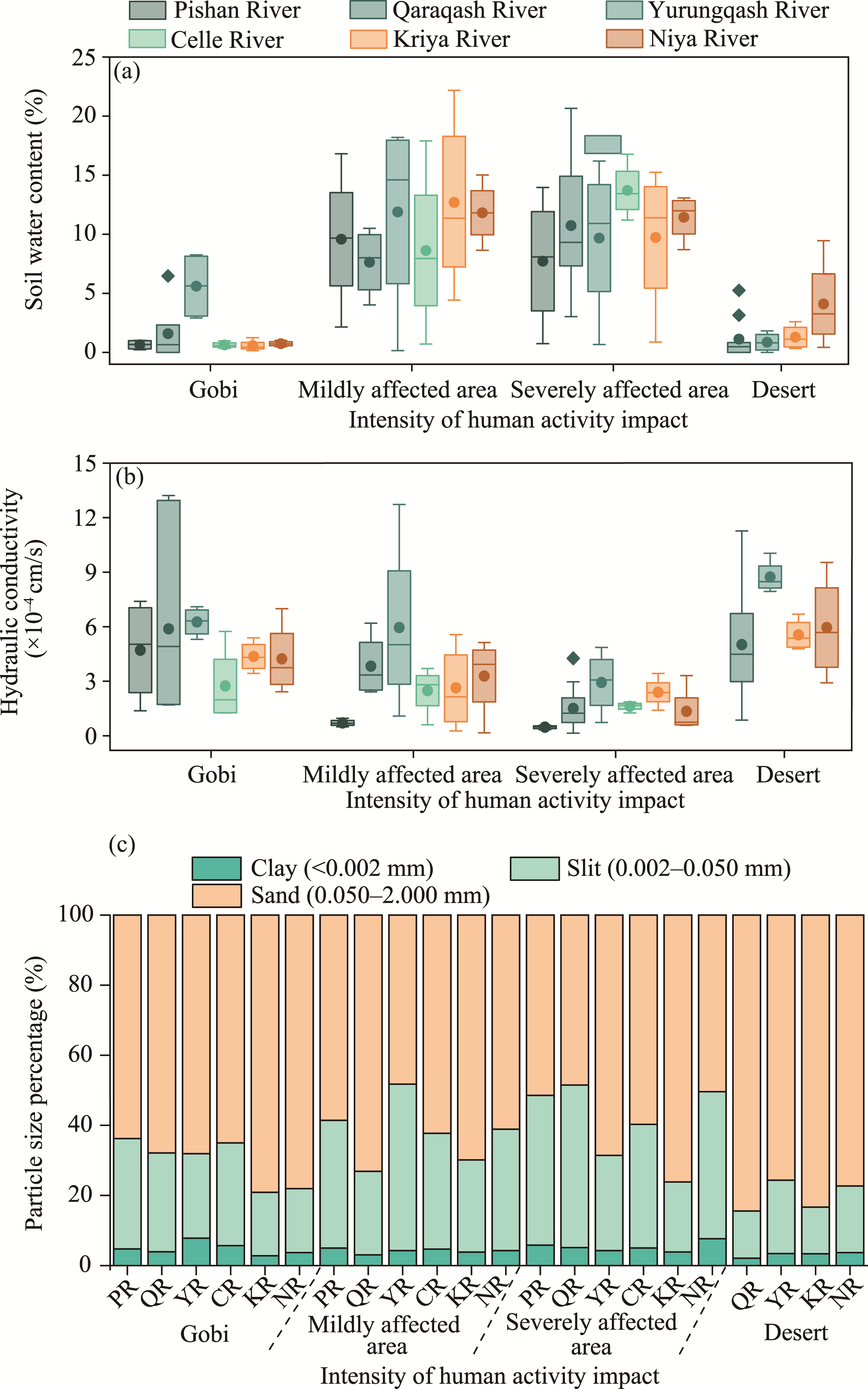Fig. 4 Change in soil physical and chemical property parameters in typical watersheds of the study area. (a), soil water content; (b), particle size percentage; (c) hydraulic conductivity. The upper and lower limits of the box plots represent the maximum and minimum values, the middle line represents median, the origin represents arithmetic mean, and the diamond-shaped block represents outlier. PR, Pishan River; QR, Qaraqash River; YR, Yurungqash River; CR, Celle River; KR, Kriya River; NR, Niya River. |