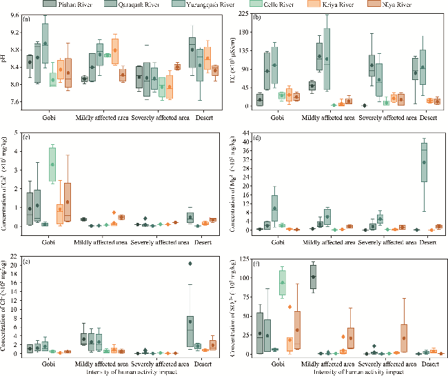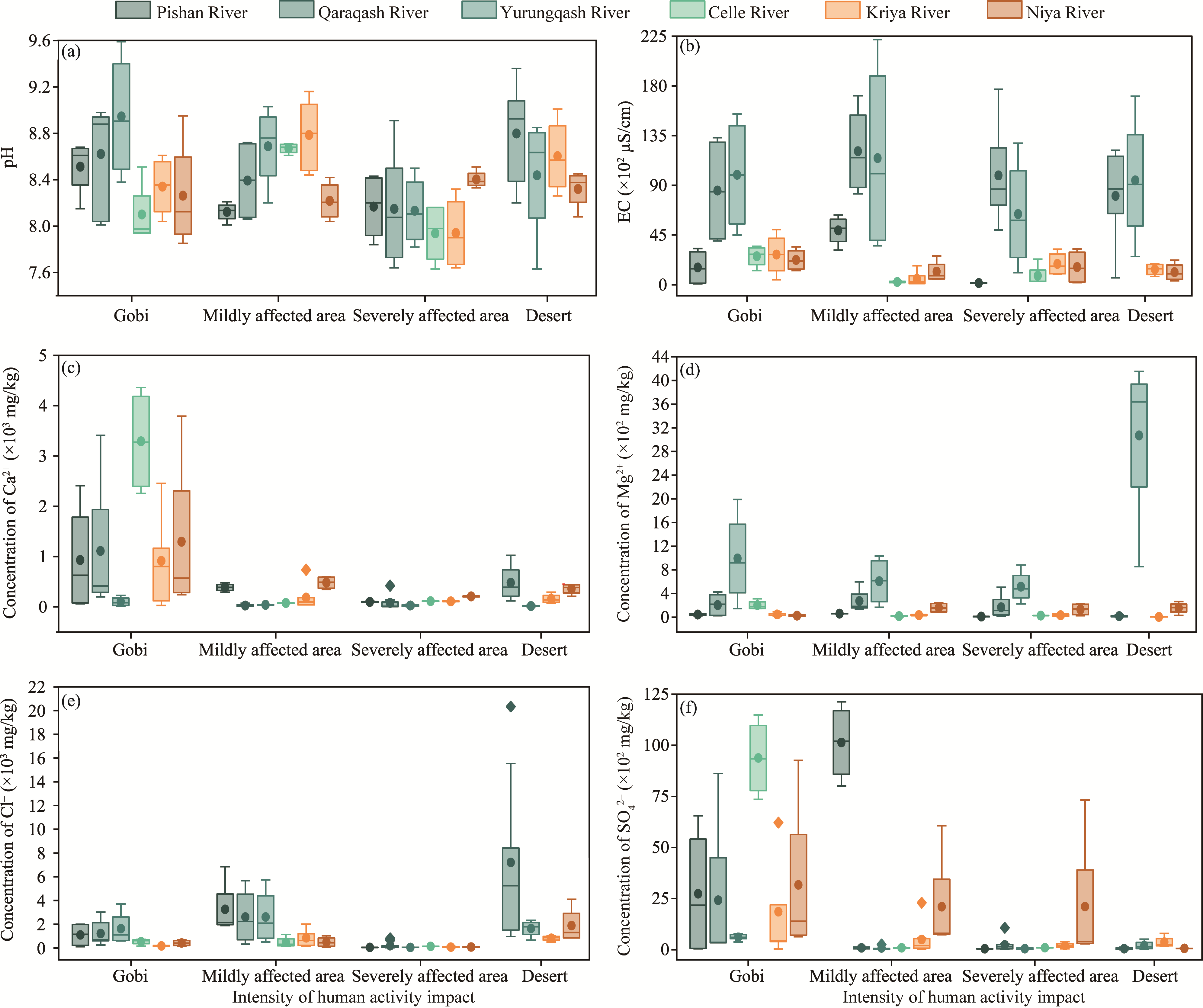 Fig. 6 Variation of soil soluble salt in typical watersheds of the study area. (a), pH; (b), EC; (c), Ca2+; (d), Mg2+; (e), Cl-; (f) SO42-. The upper and lower limits of the box plots represent the maximum and minimum values, the middle line represents median, the origin represents arithmetic mean, and the diamond-shaped block represents outlier. |