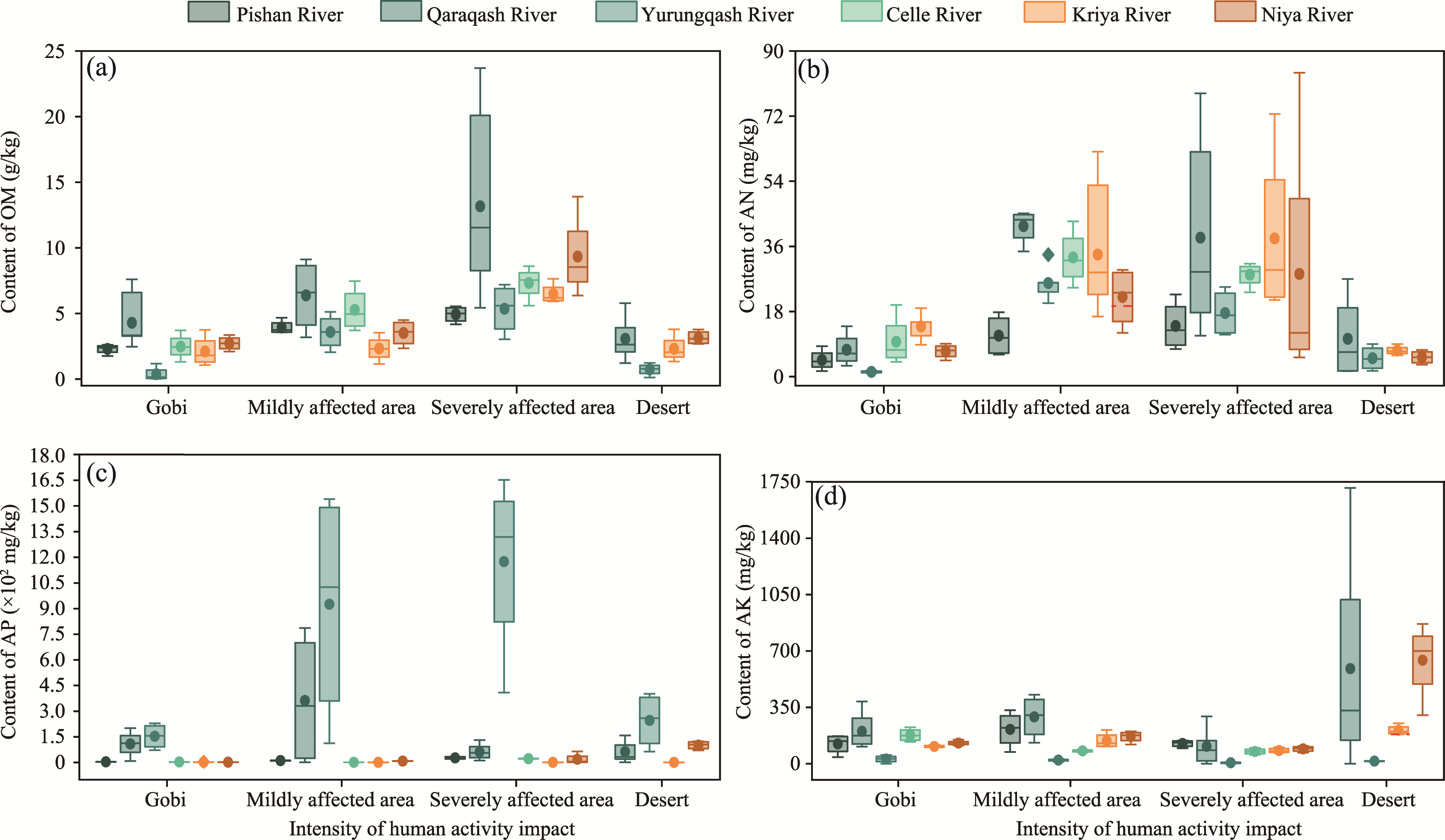 Fig. 8 Variation of soil nutrient in typical watersheds in the study area. (a), OM; (b), AN; (c), AP; (d), AK. The upper and lower limits of the box plots represent the maximum and minimum values, the middle line represents median, the origin represents arithmetic mean, and the diamond-shaped block represents outlier. |
