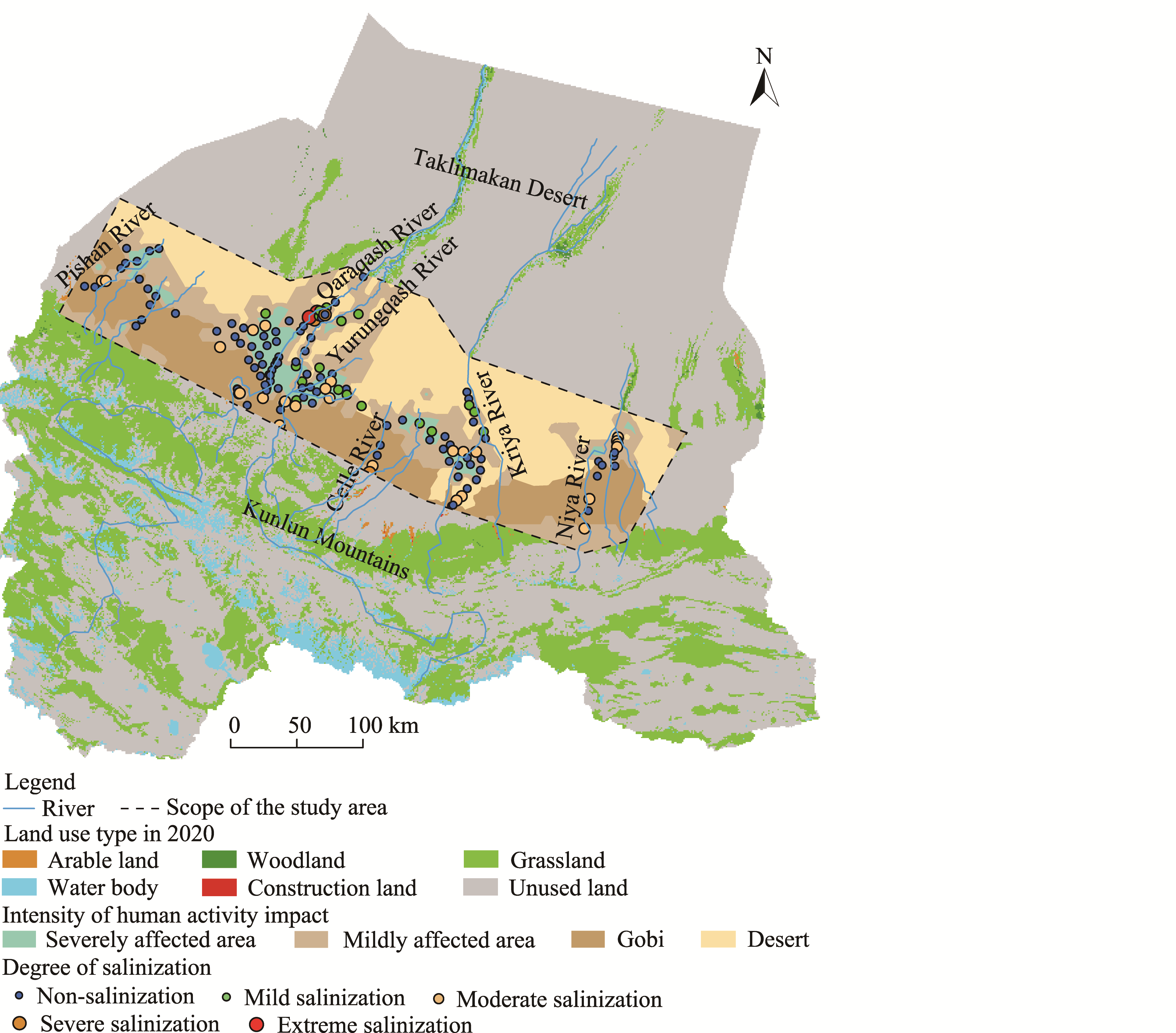 Spatial distribution of soil salinization under the influence of human activities in arid areas, China