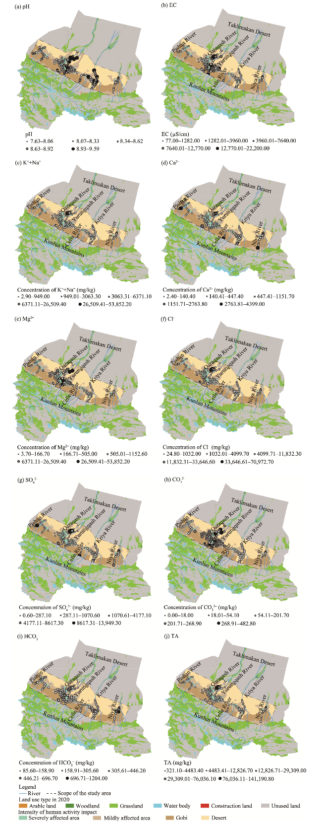 Fig. 5 Spatial distribution of soil soluble salt in the study area. (a), pH; (b), electrical conductivity (EC); (c), K++Na+; (d), Ca2+; (e), Mg2+; (f), Cl-; (g), SO42-; (h), CO32-; (i), HCO3-; (j), total salt content (TA). |