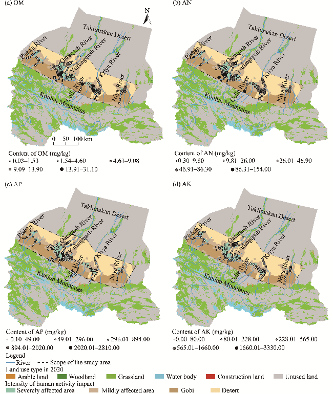 Fig. 7 Spatial distribution of soil nutrient in the study area. (a), organic matter (OM); (b), available nitrogen (AN); (c), available phosphorus (AP); (d), available potassium (AK). |