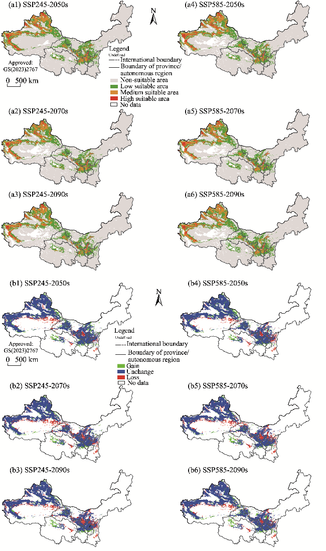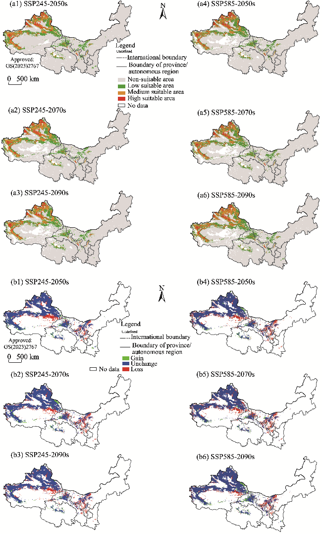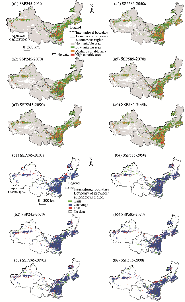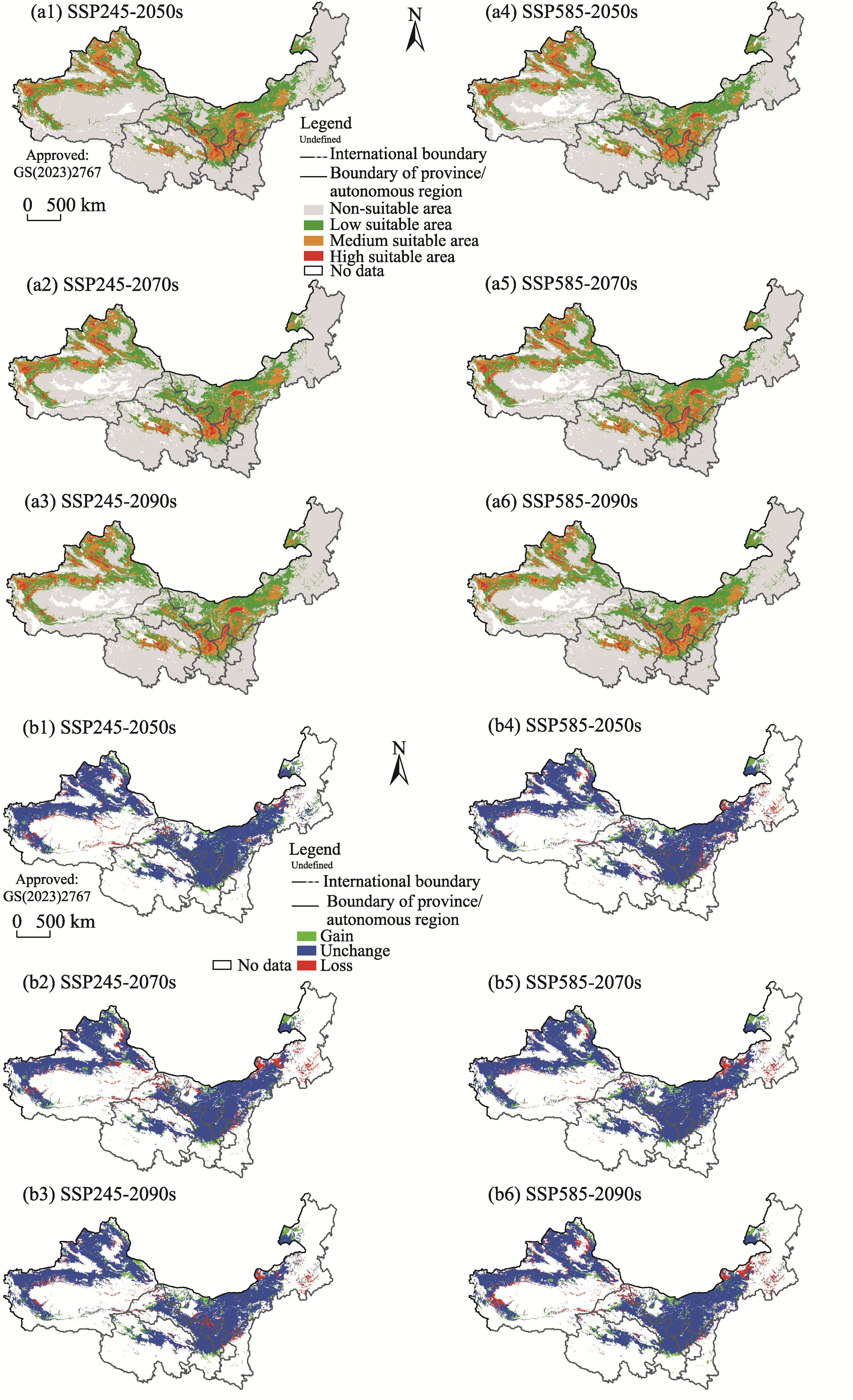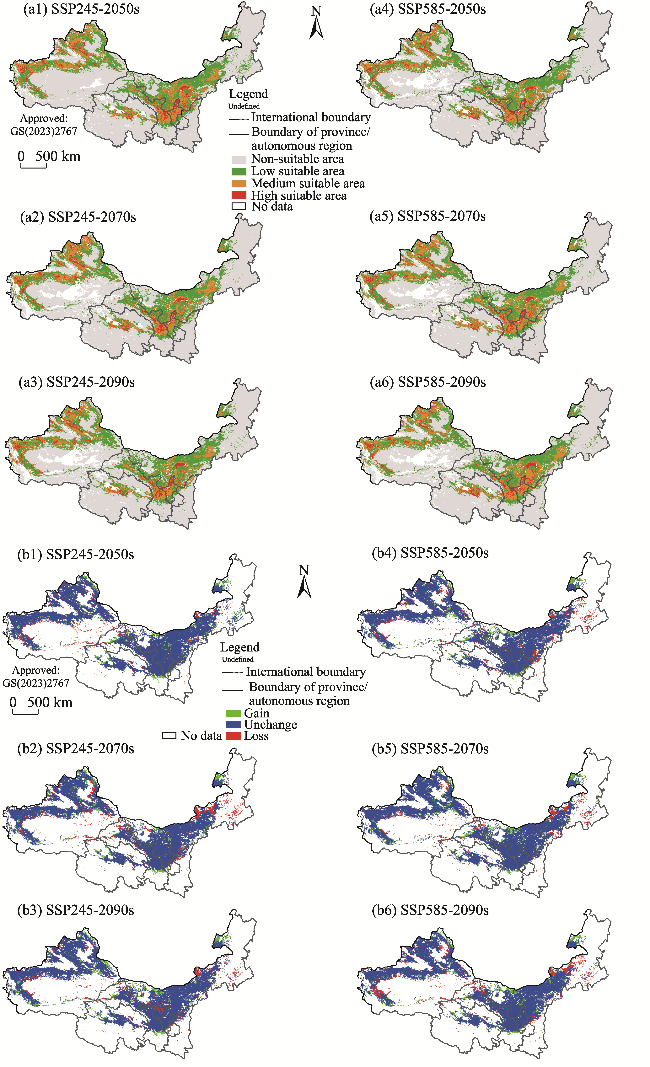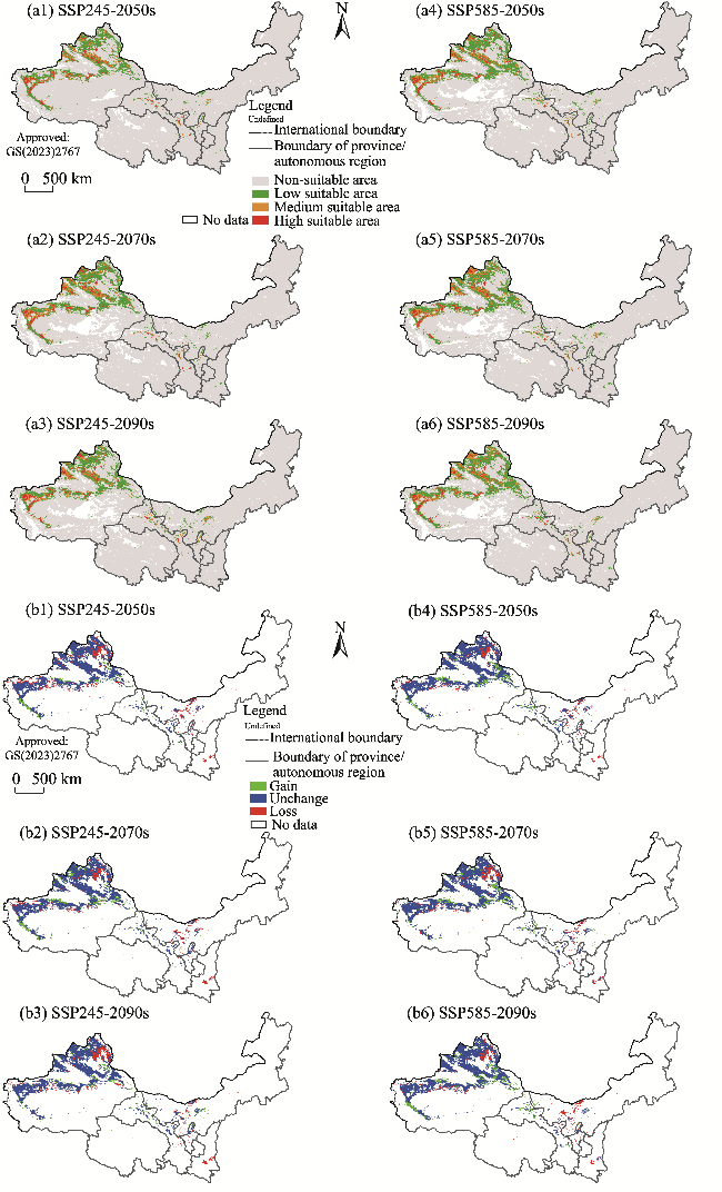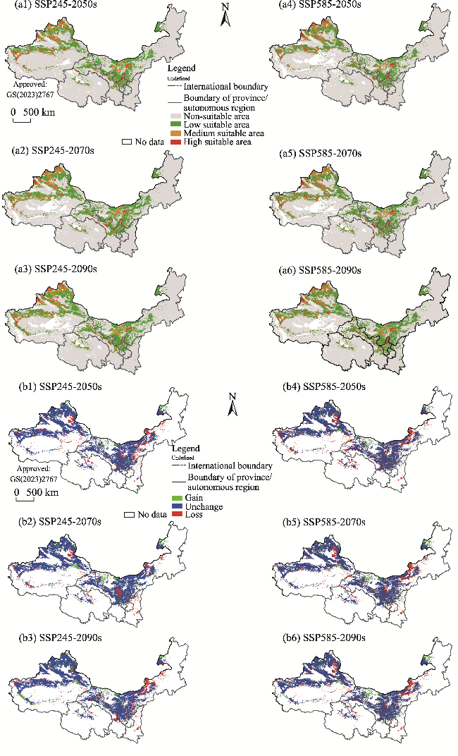 Fig. 9 Potential suitable habitats (a1, a2, a3, a4, a5, and a6) and changes in the distribution range (b1, b2, b3, b4, b5, and b6) of H. strobilaceum in the future (2050s, 2070s, and 2090s) under two climate scenarios (SSP245 and SSP585) compared to its current distribution in the arid areas of Northwest China. Note that the figures are based on the standard map (GS(2023)2767) of the Map Service System (http://bzdt.ch.mnr.gov.cn/) marked by the Ministry of Natural Resources of the People's Republic of China, and the boundary of the standard map has not been modified. |