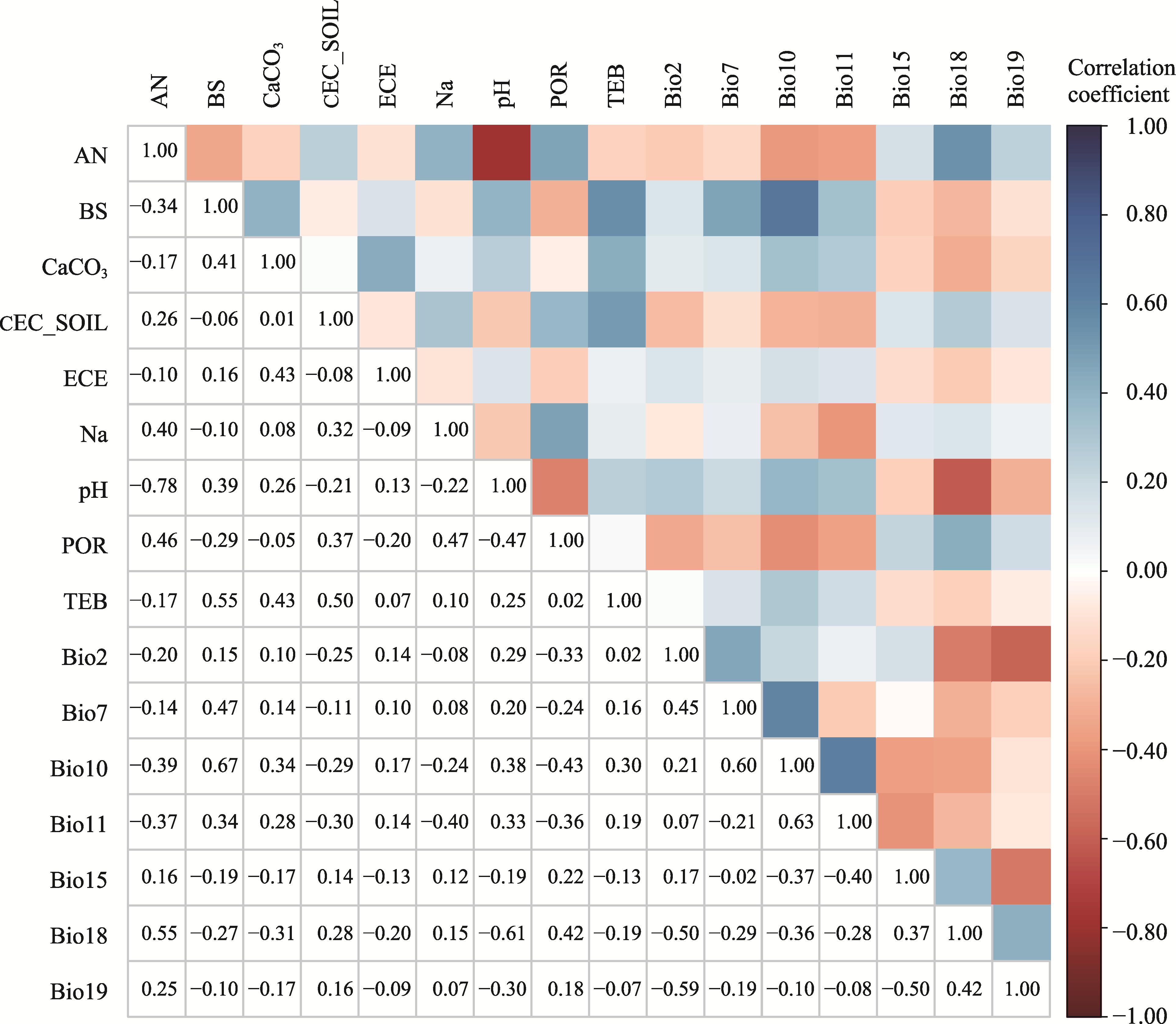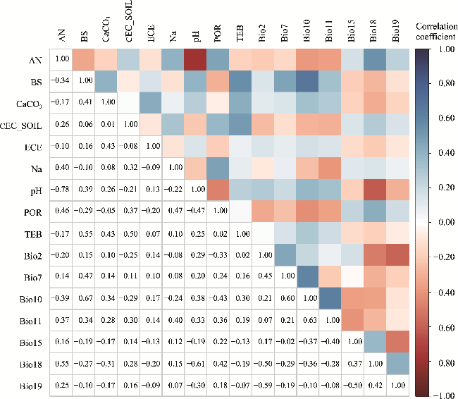 Fig. 2 Pearson's correlation analysis of the 16 selected environmental variables. AN, available nitrogen; BS, soil base saturation; CaCO3, soil calcium carbonate; CEC_SOIL, cation exchange capacity; ECE, electrical conductivity; Na, exchangeable Na+; pH, acidity and basicity; POR, porosity; TEB, soil exchangeable base; Bio2, mean diurnal range; Bio7, temperature annual range; Bio10, mean temperature of the warmest quarter; Bio11, mean temperature of the coldest quarter; Bio15, precipitation seasonality (coefficient of variation); Bio18, precipitation of the warmest quarter; Bio19, precipitation of the coldest quarter. |