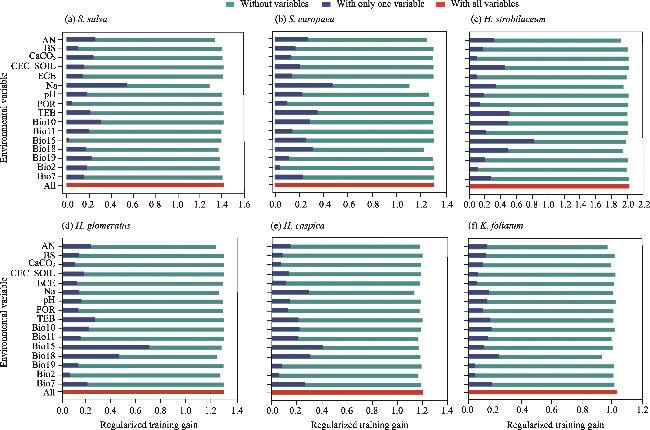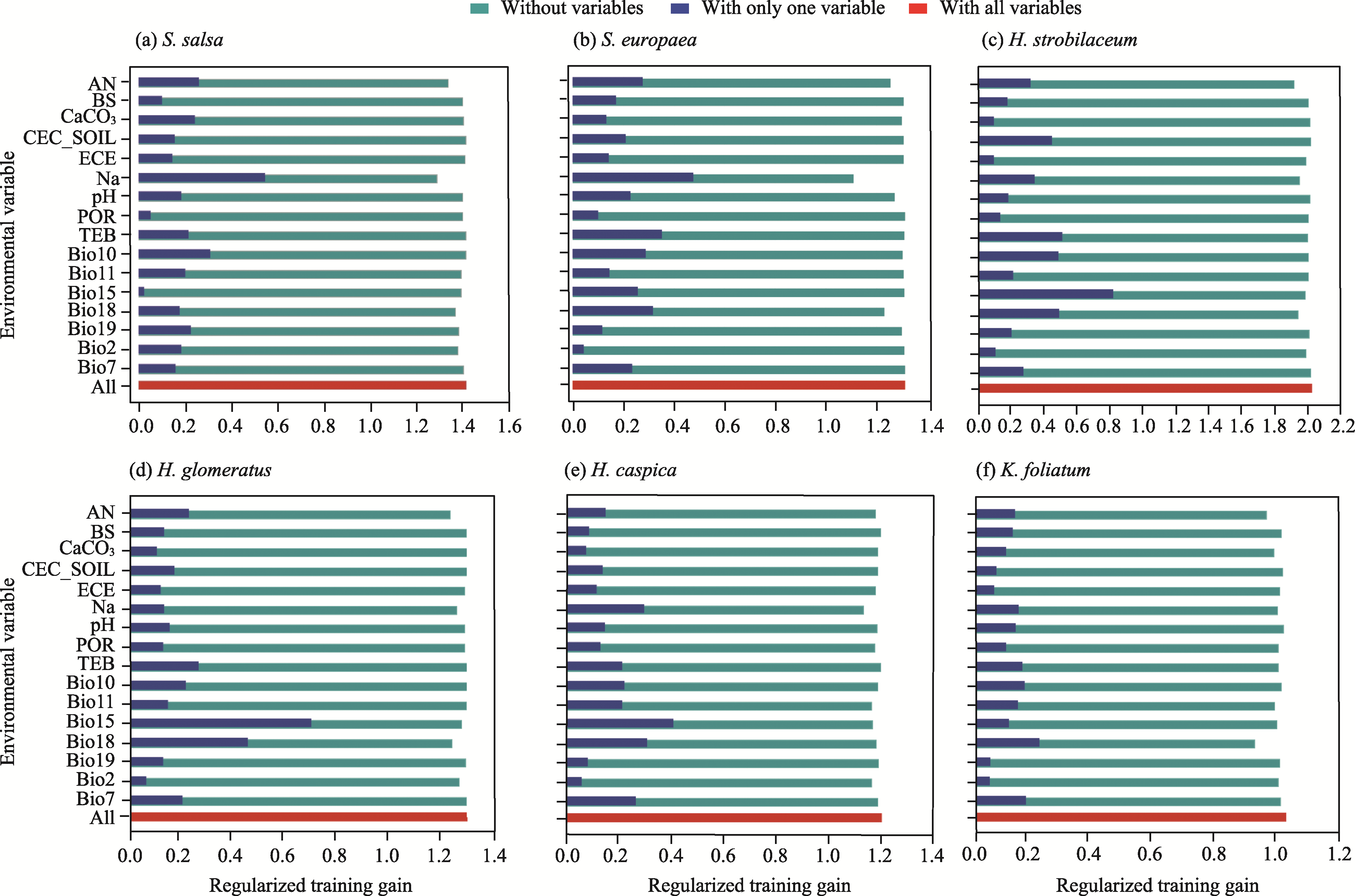 Fig. 3 Contribution rates of the selected 16 environmental variables to the distribution of six halophytic plant species based on the Jackknife test. (a), S. salsa; (b), S. europaea; (c), H. strobilaceum; (d), H. glomeratus; (e), H. capsica; (f), K. foliatum. |
