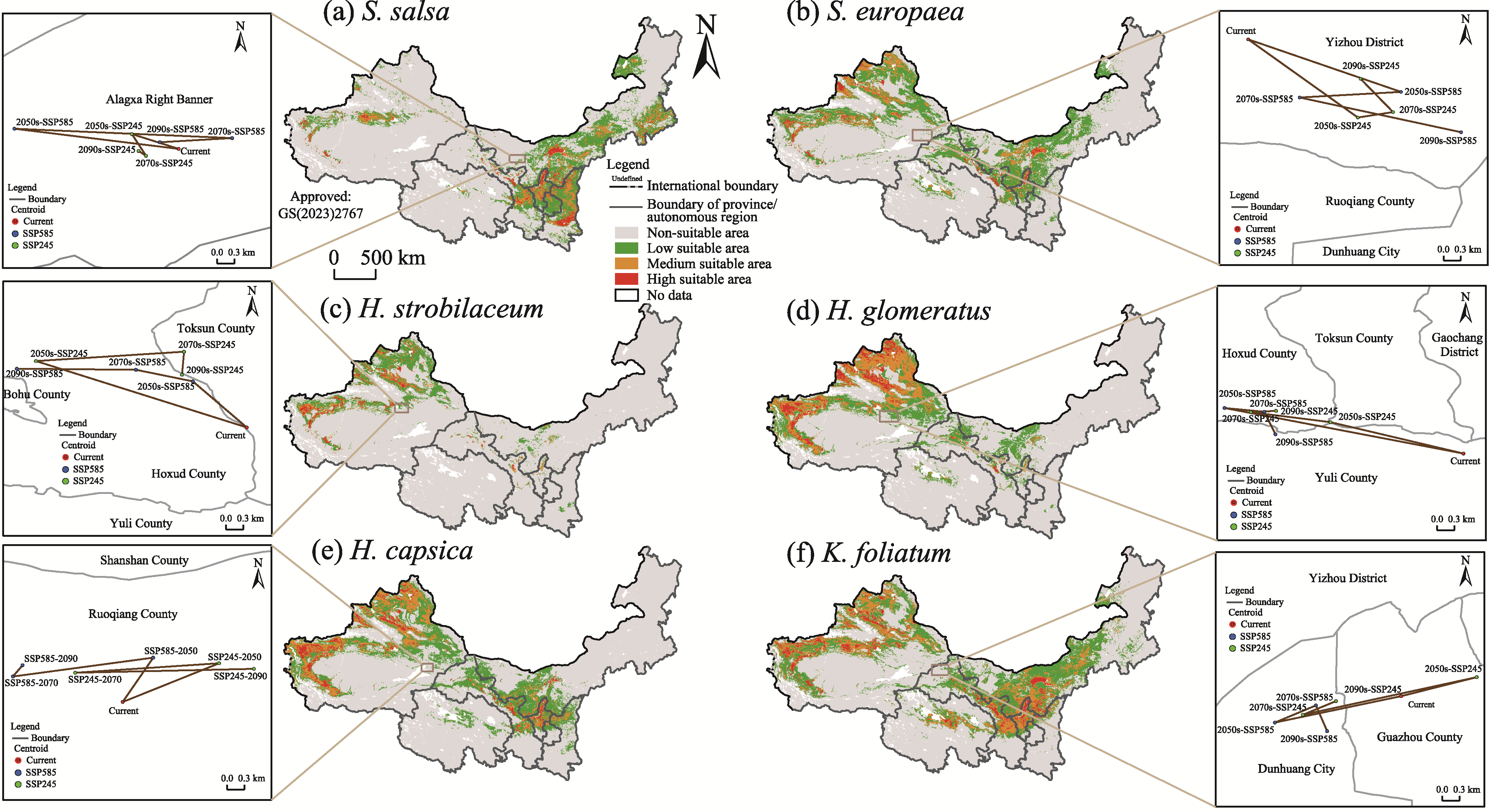 Fig. 4 Predicted current distribution ranges and changes in the centroid distribution of six halophytic plant species in the future (2050s, 2070s, and 2090s) under two climate scenarios (SSP245 and SSP585) in the arid areas of Northwest China. (a), S. salsa; (b), S. europaea; (c), H. strobilaceum; (d), H. glomeratus; (e), H. capsica; (f), K. foliatum. SSP, Shared Socio-economic Pathway. Note that the figures are based on the standard map (GS(2023)2767) of the Map Service System (http://bzdt.ch.mnr.gov.cn/) marked by the Ministry of Natural Resources of the People's Republic of China, and the boundary of the standard map has not been modified. |