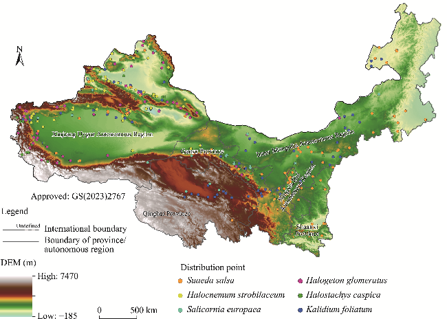 Fig. 1 Overview of the study area based on the digital elevation model (DEM) and distribution points of six halophytic plant species (Halostachys caspica (Bieb.) C. A. Mey., Halogeton glomeratus (Bieb.) C. A. Mey., Kalidium foliatum (Pall.) Moq., Halocnemum strobilaceum (Pall.) Bieb., Salicornia europaea L., and Suaeda salsa (L.) Pall.) in the arid areas of Northwest China. The DEM data were obtained from the Hydrological data and maps based on SHuttle Elevation Derivatives at multiple Scales (HydroSHEDS; https://hydrosheds.org/downloads). Note that the figure is based on the standard map (GS(2023)2767) of the Map Service System (http://bzdt.ch.mnr.gov.cn/) marked by the Ministry of Natural Resources of the People's Republic of China, and the boundary of the standard map has not been modified. |